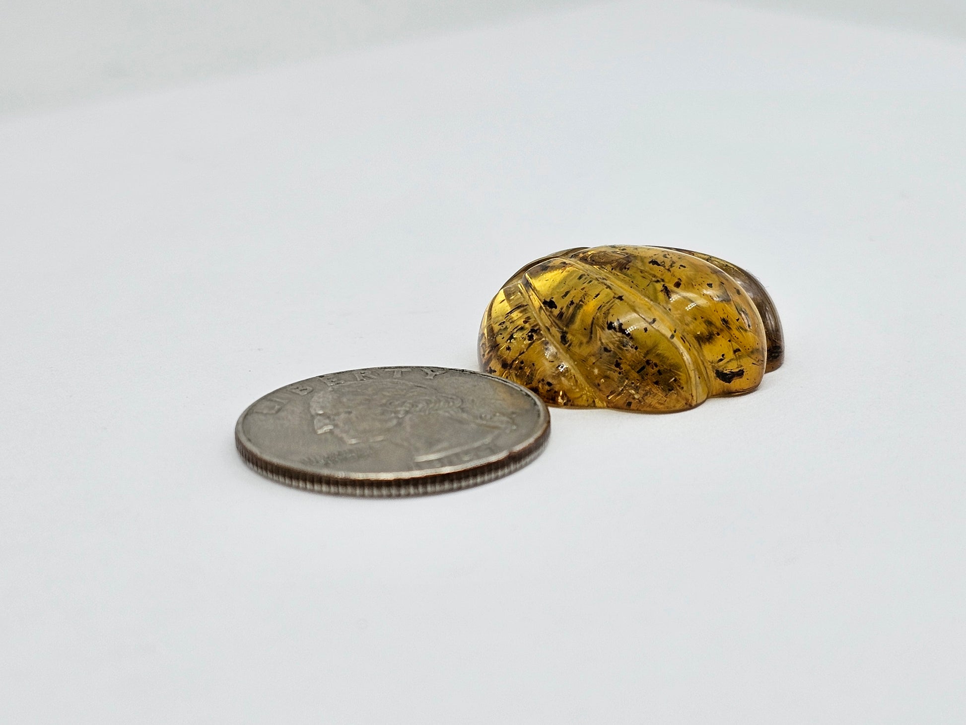 This hand-carved amber cabochon takes the form of a pumpkin, glowing with rich golden tones and a fascinating bug inclusion, adding a unique touch to the piece. The carving enhances its warm, autumn-like charm, making it a standout piece for seasonal jewelry or unique collections.