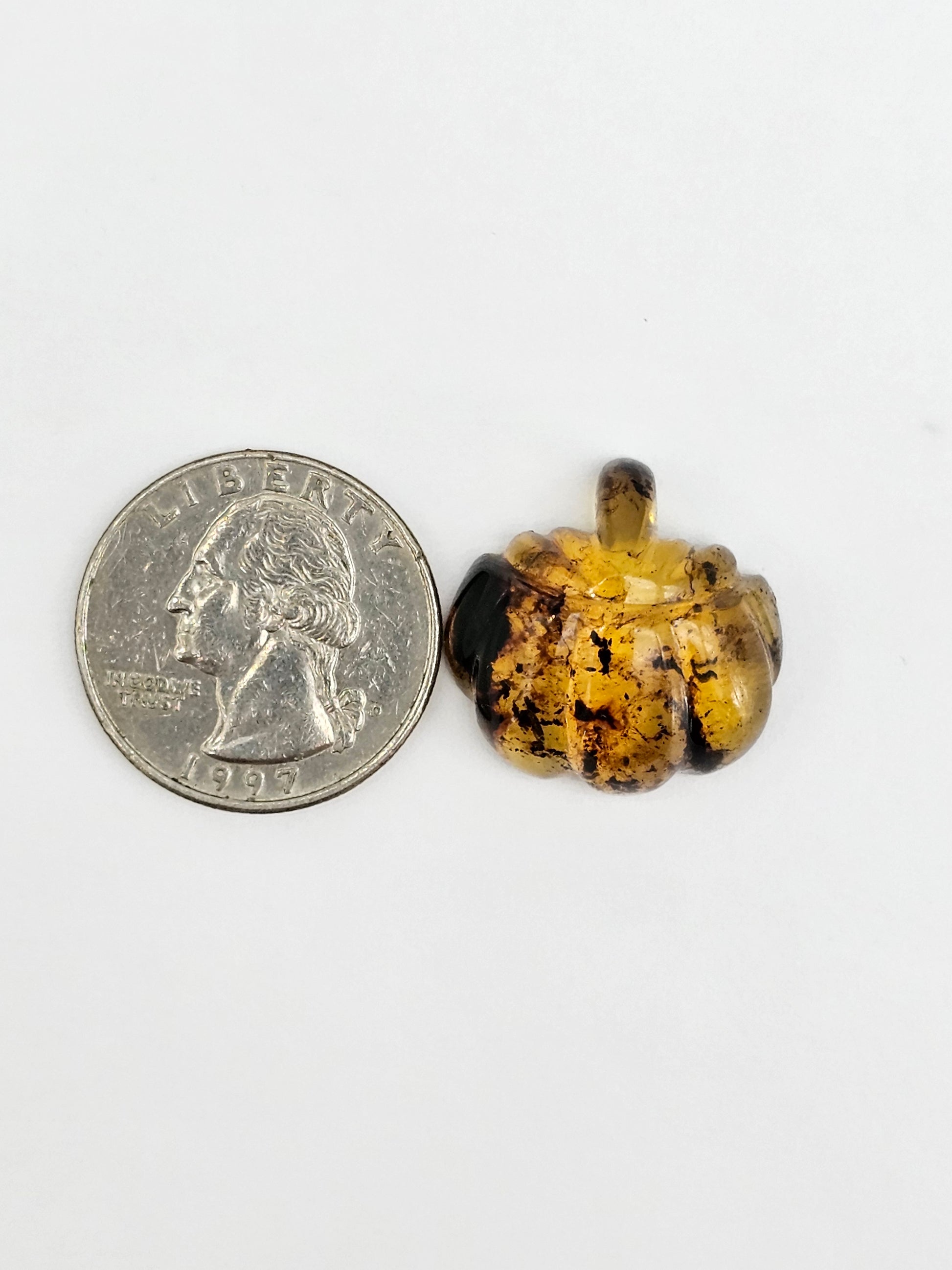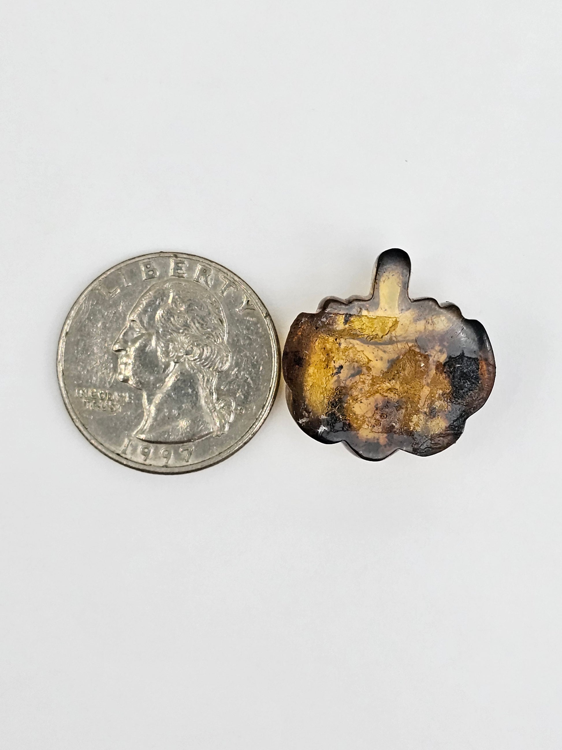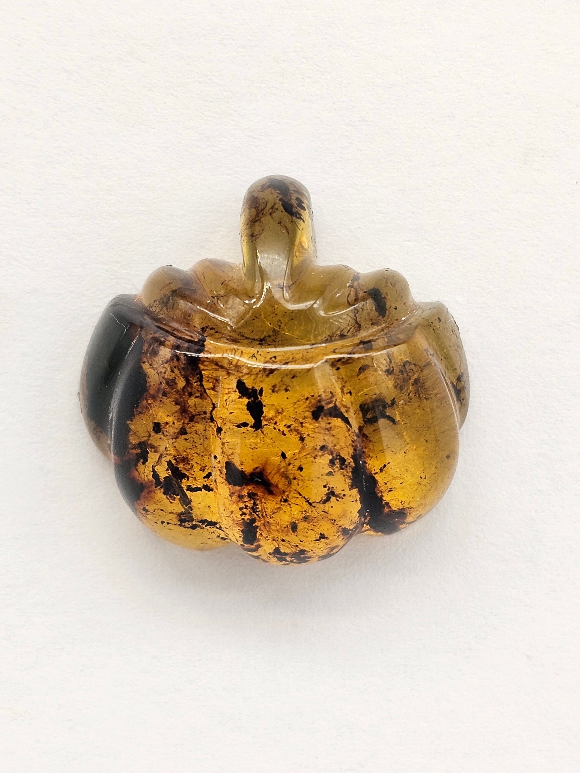 This hand-carved amber cabochon takes the form of a pumpkin, glowing with rich golden tones and natural inclusions inside the stone. The carving enhances its warm, autumn-like charm, making it a standout piece for seasonal jewelry or unique collections.