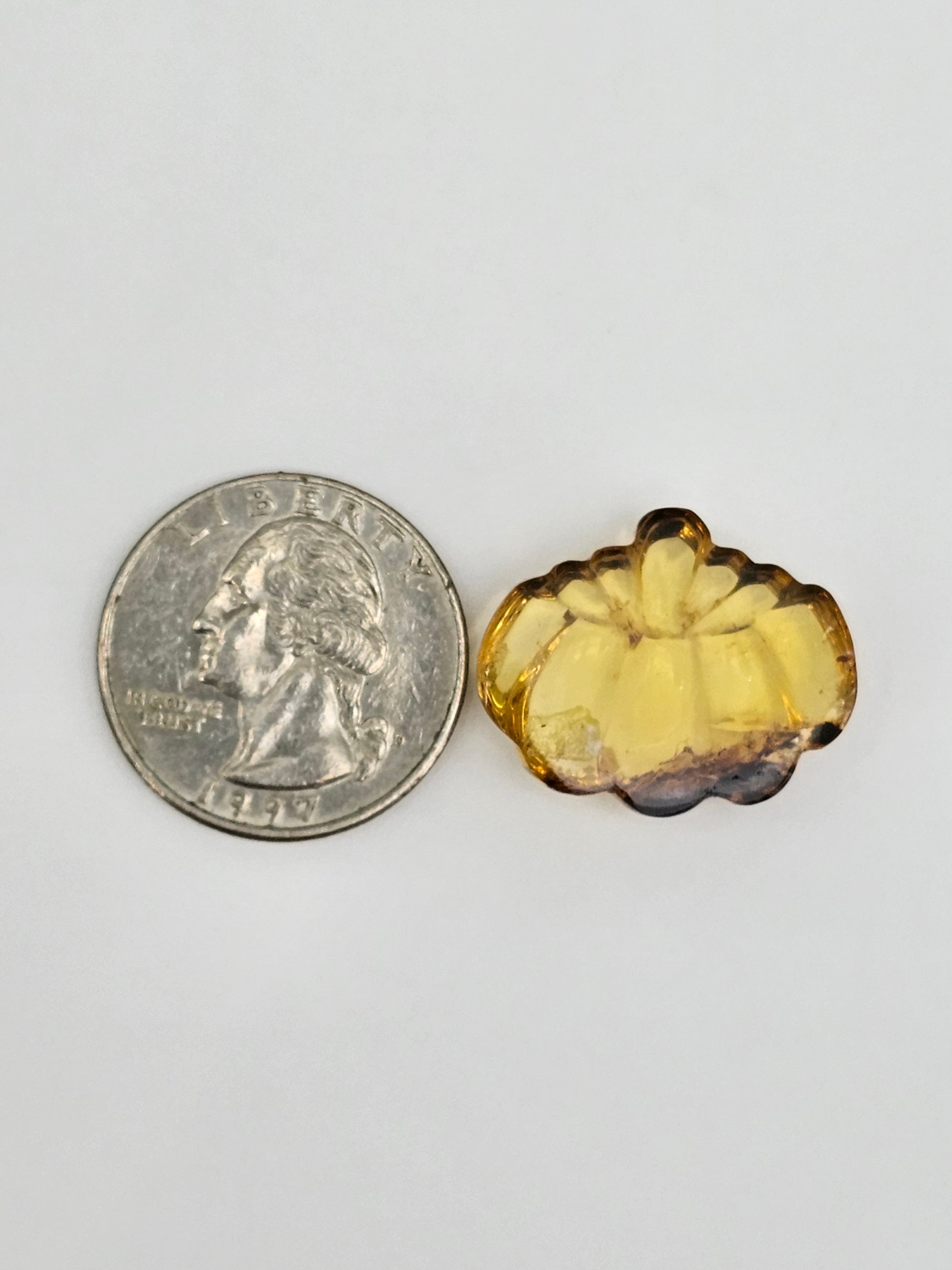 This hand-carved amber cabochon takes the form of a pumpkin, glowing with rich golden tones and natural inclusions inside the stone. The carving enhances its warm, autumn-like charm, making it a standout piece for seasonal jewelry or unique collections.