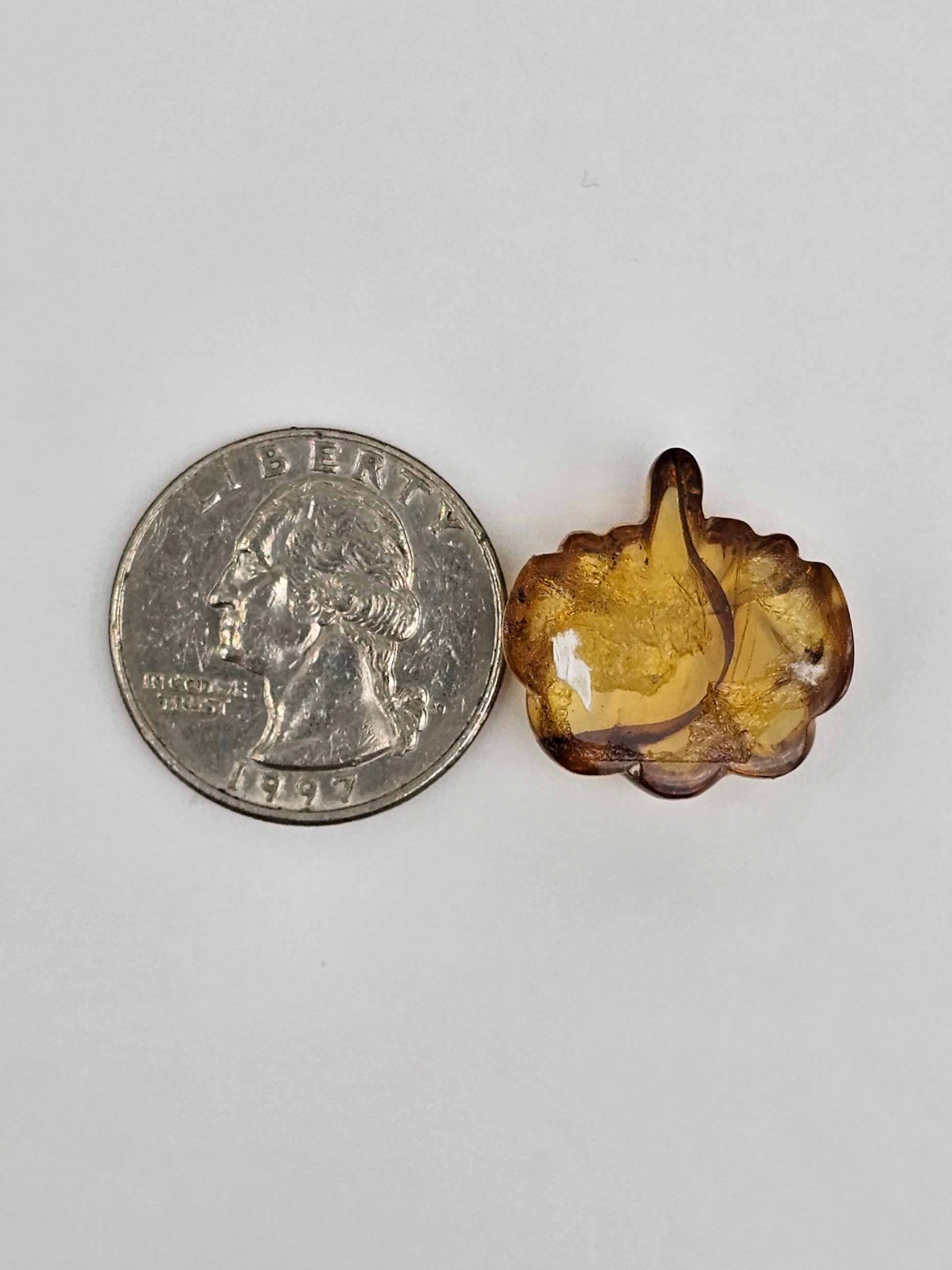 This hand-carved amber cabochon takes the form of a pumpkin, glowing with rich golden tones and natural inclusions inside the stone. The carving enhances its warm, autumn-like charm, making it a standout piece for seasonal jewelry or unique collections.