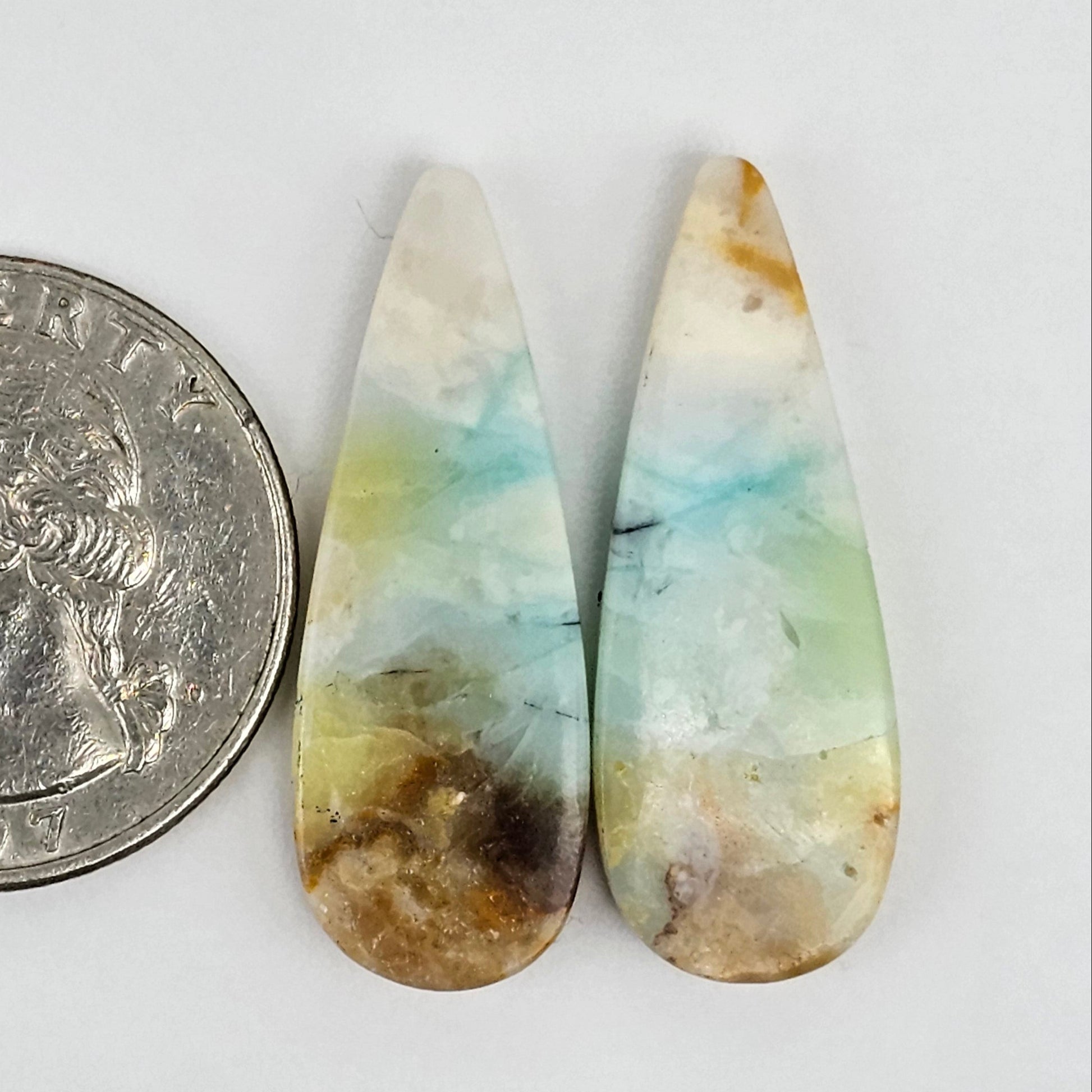 This stunning pair of Blue Opal Petrified Wood Cabochons showcases beautiful layers of soft blues, greens, and earthy tones. Their smooth, teardrop shape makes them perfect for crafting unique jewelry pieces like earrings or pendants. Each cabochon features distinct patterns that add character and charm to your collection. Enhance your designs with this captivating pair!