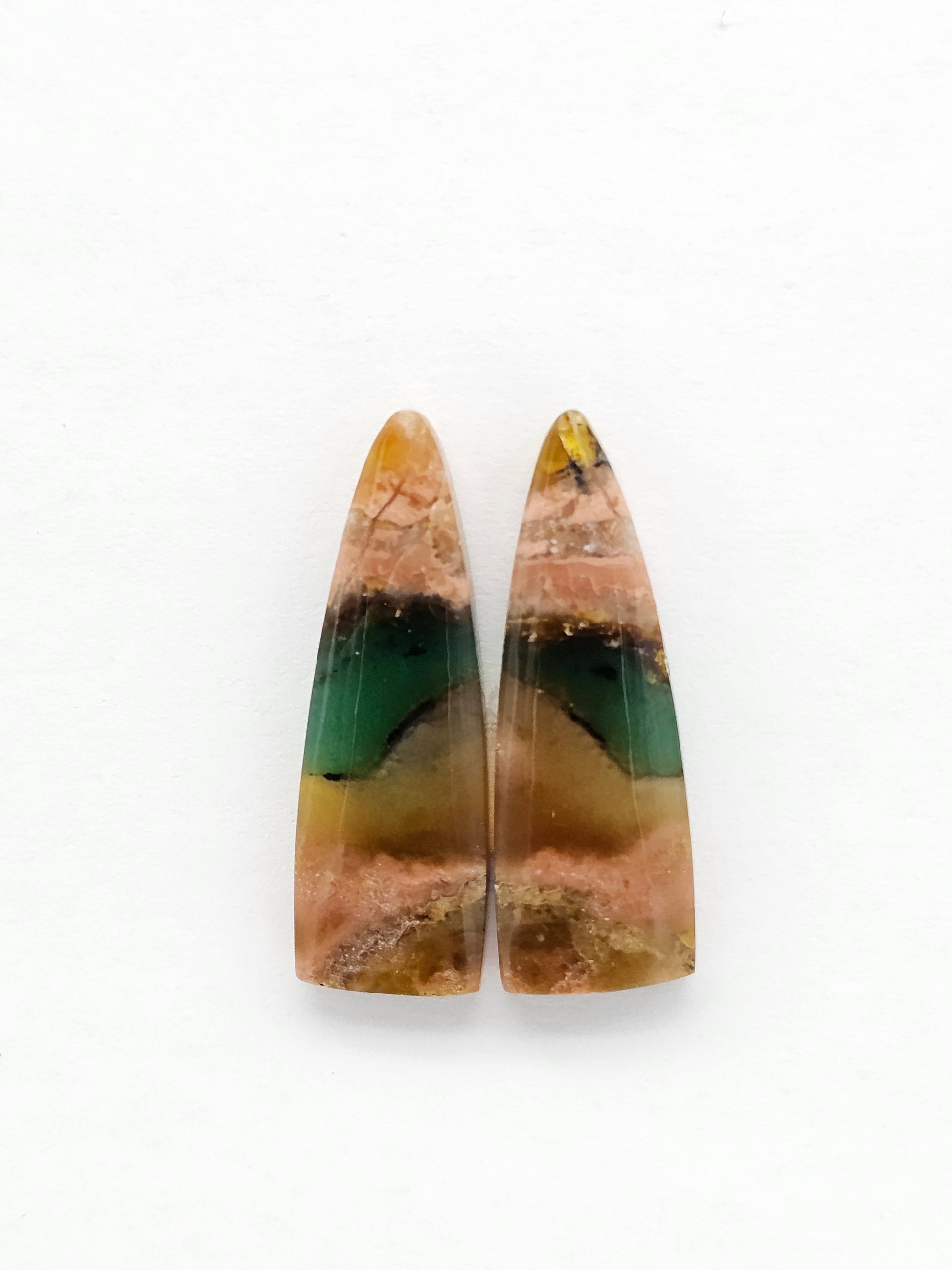 This stunning pair of Blue Opal Petrified Wood Cabochons showcases beautiful layers of soft blues, greens, and earthy tones. Their smooth, triangular shape makes them perfect for crafting unique jewelry pieces like earrings or pendants. Each cabochon features distinct patterns that add character and charm to your collection. Enhance your designs with this captivating pair!