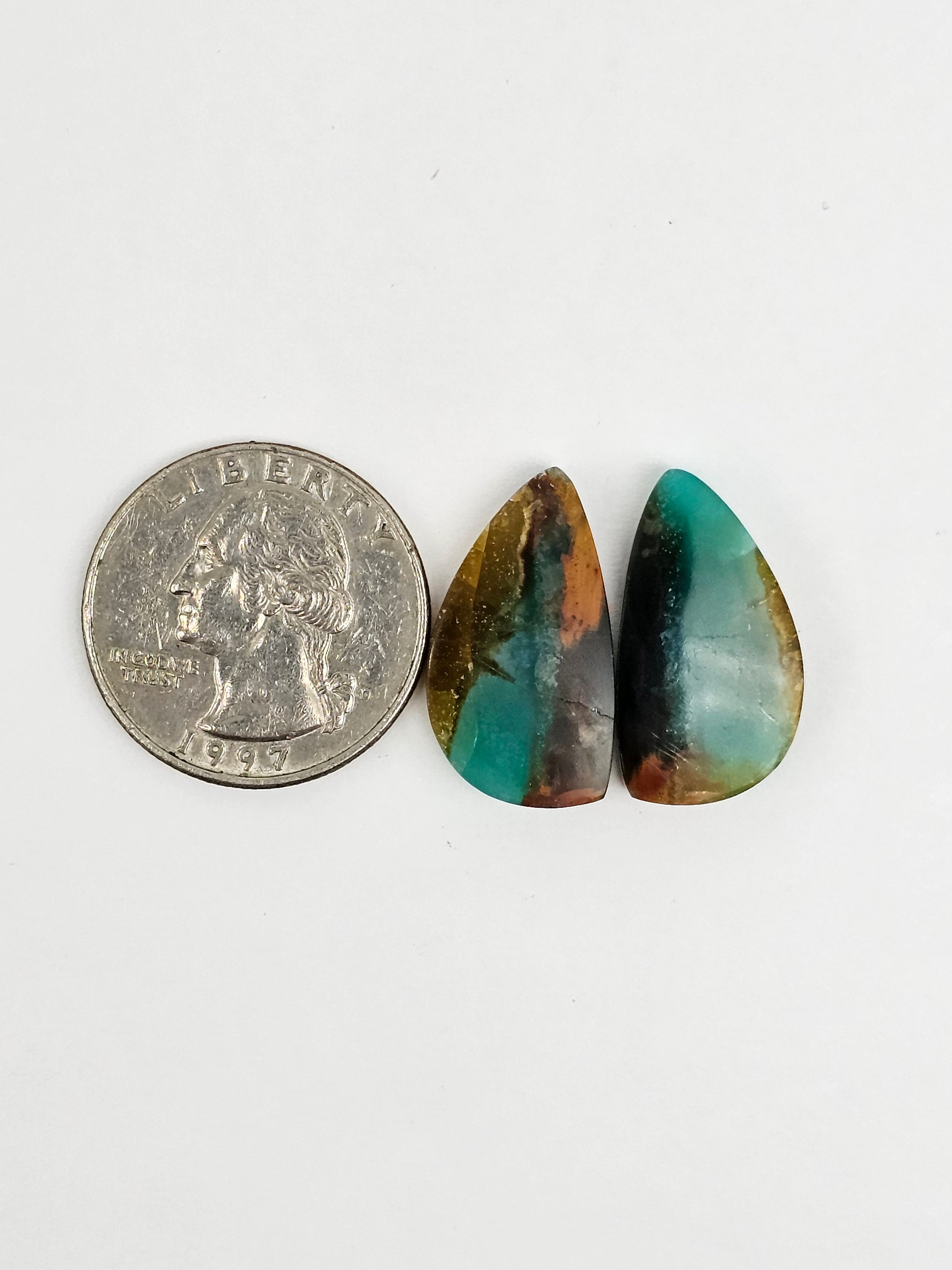 This stunning pair of Blue Opal Petrified Wood Cabochons showcases beautiful layers of soft blues, greens, and earthy tones. Their smooth, freeform shape makes them perfect for crafting unique jewelry pieces like earrings or pendants. Each cabochon features distinct patterns that add character and charm to your collection. Enhance your designs with this captivating pair!