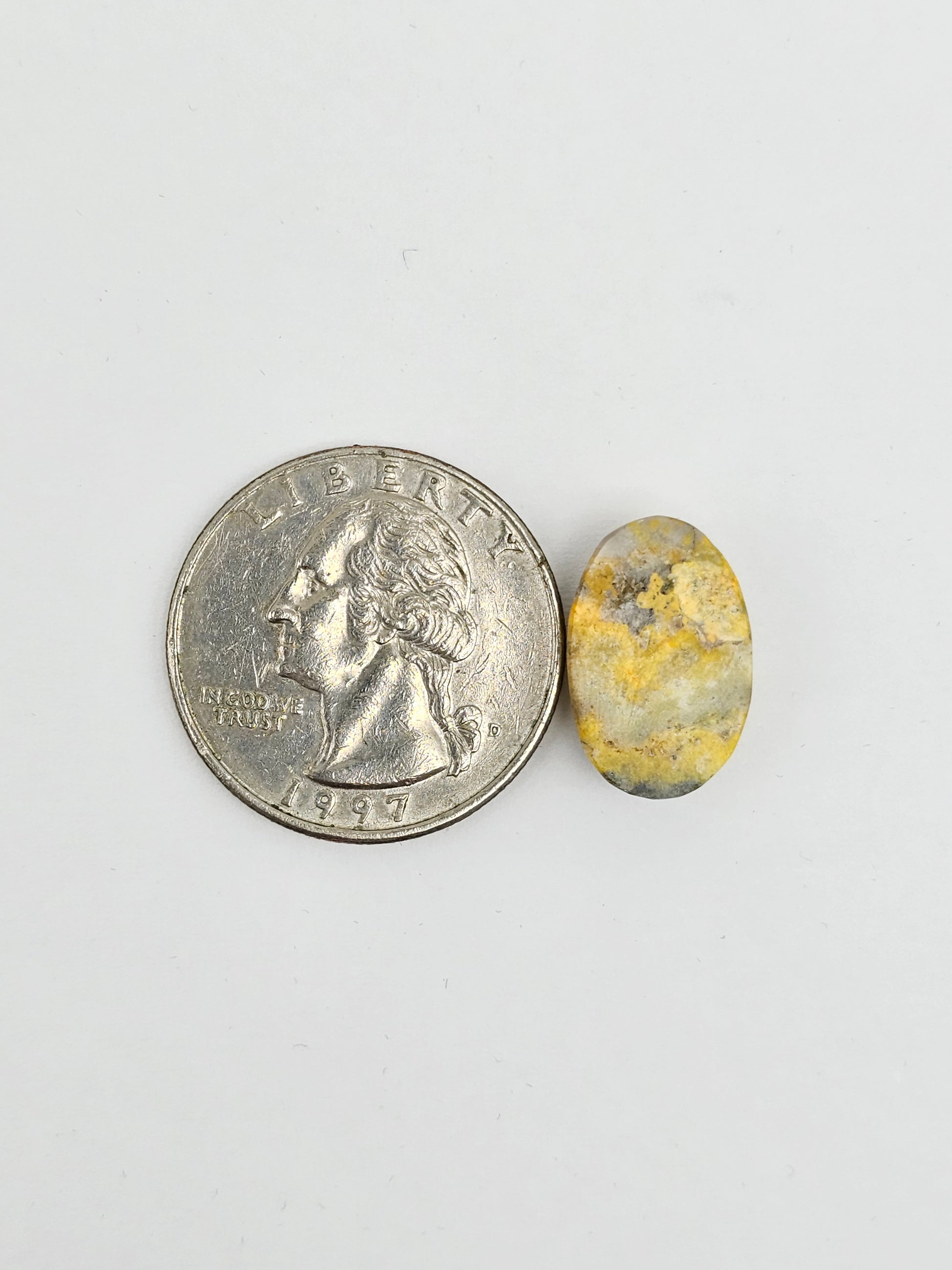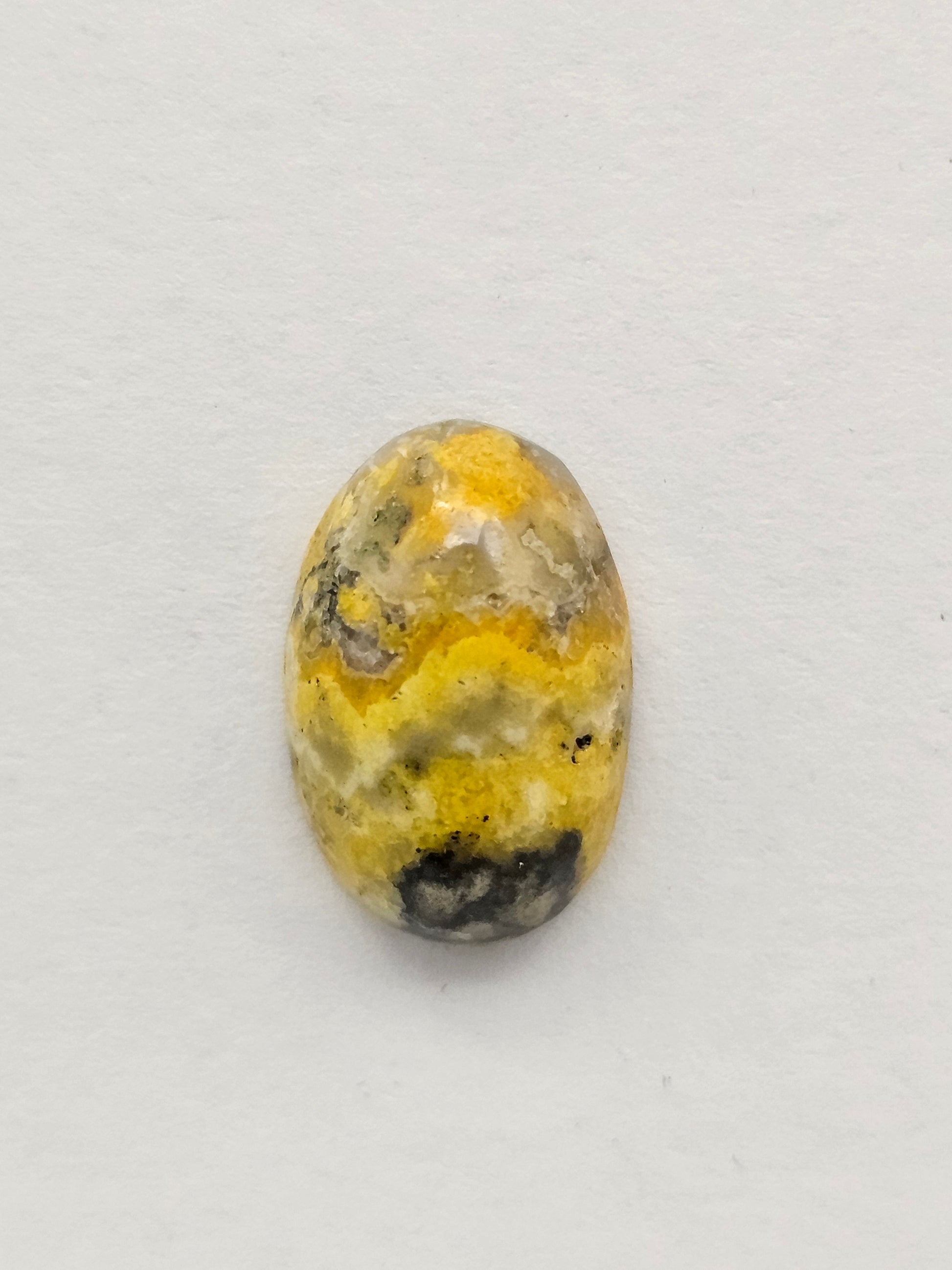This Bumblebee Jasper cabochon displays bright yellow and soft grey patterns across its polished surface. The bold color contrast brings a lively, energetic feel to the piece. Often associated with creativity and confidence, it’s a great choice for standout jewelry or a vibrant addition to any collection.