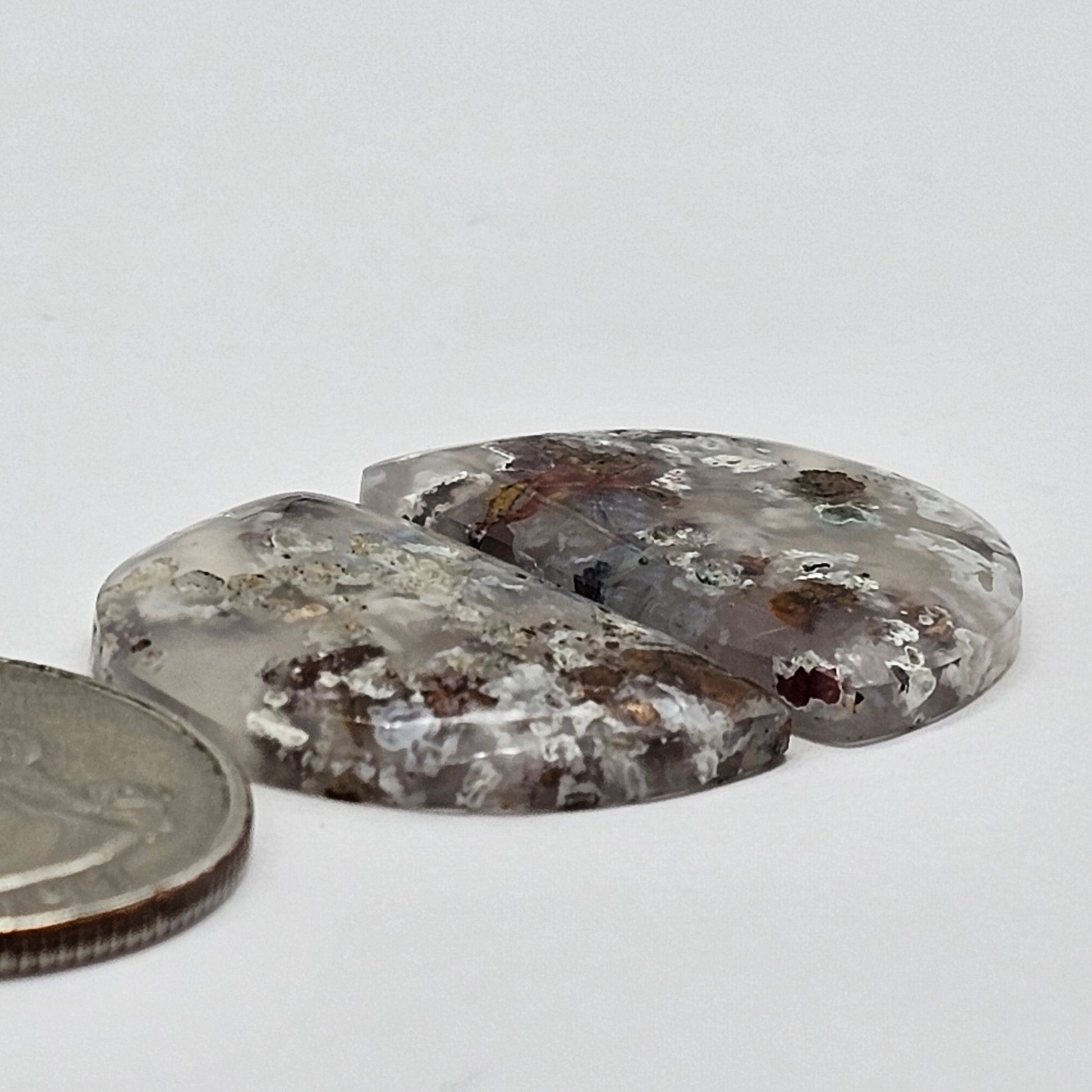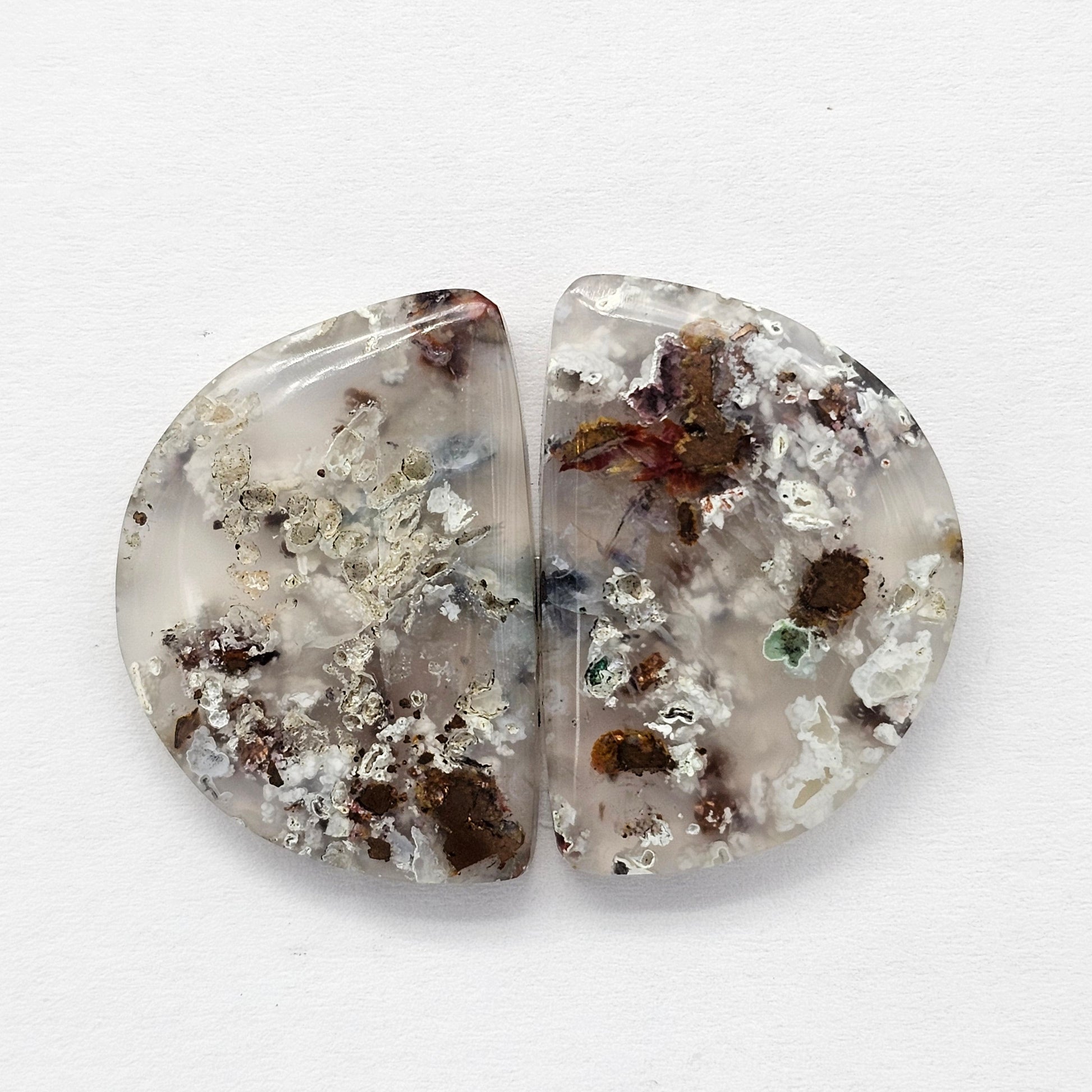 This stunning pair of Chalcedony Cabochons features a beautiful blend of soft hues with sparkling native copper inclusions. Their smooth, unique shapes make them ideal for creating unique jewelry pieces like earrings or pendants. Each cabochon showcases distinct patterns, adding charm and elegance to your collection. Enhance your designs with this captivating pair!