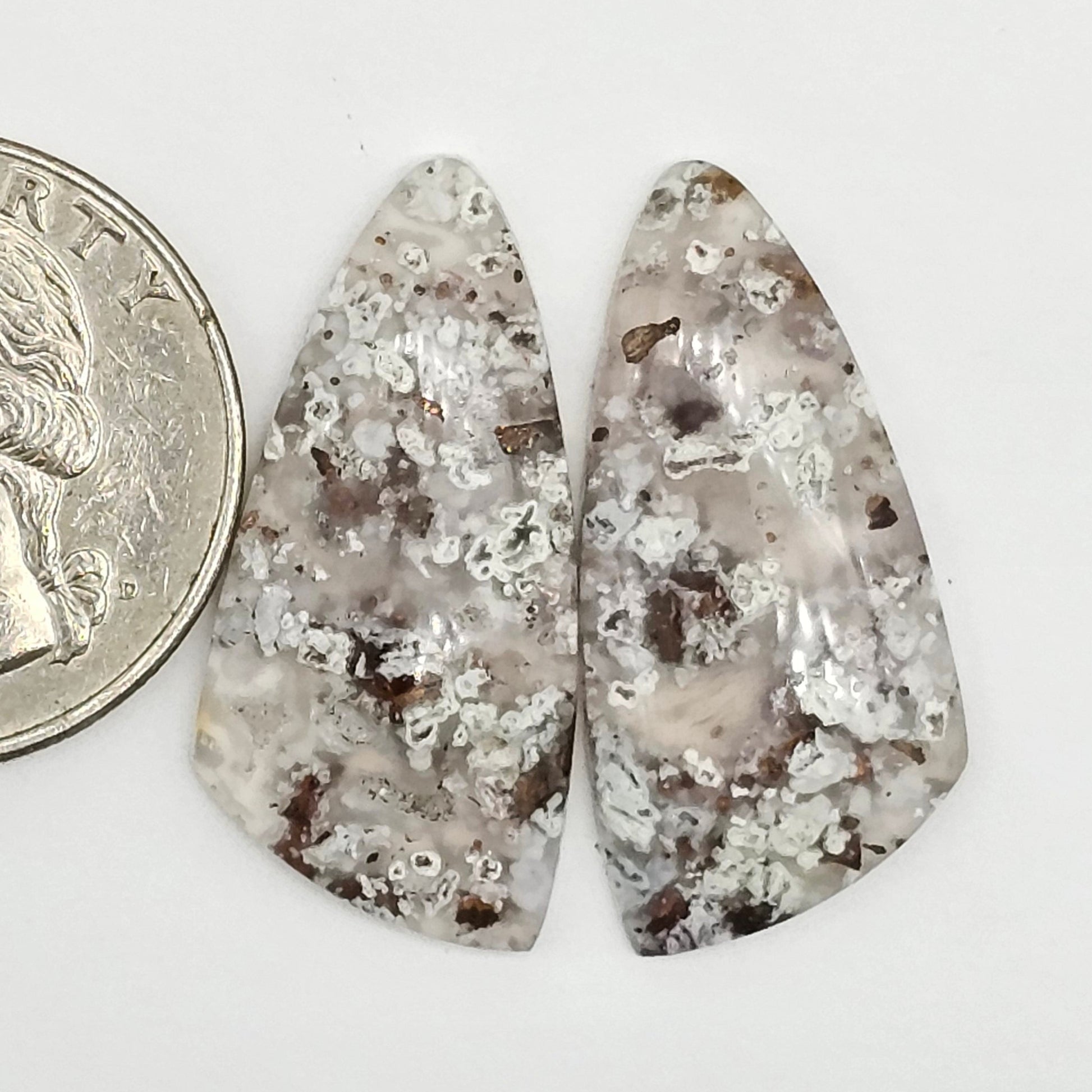 This stunning pair of Chalcedony Cabochons features a beautiful blend of soft hues with sparkling native copper inclusions. Their smooth, unique shapes make them ideal for creating unique jewelry pieces like earrings or pendants. Each cabochon showcases distinct patterns, adding charm and elegance to your collection. Enhance your designs with this captivating pair!