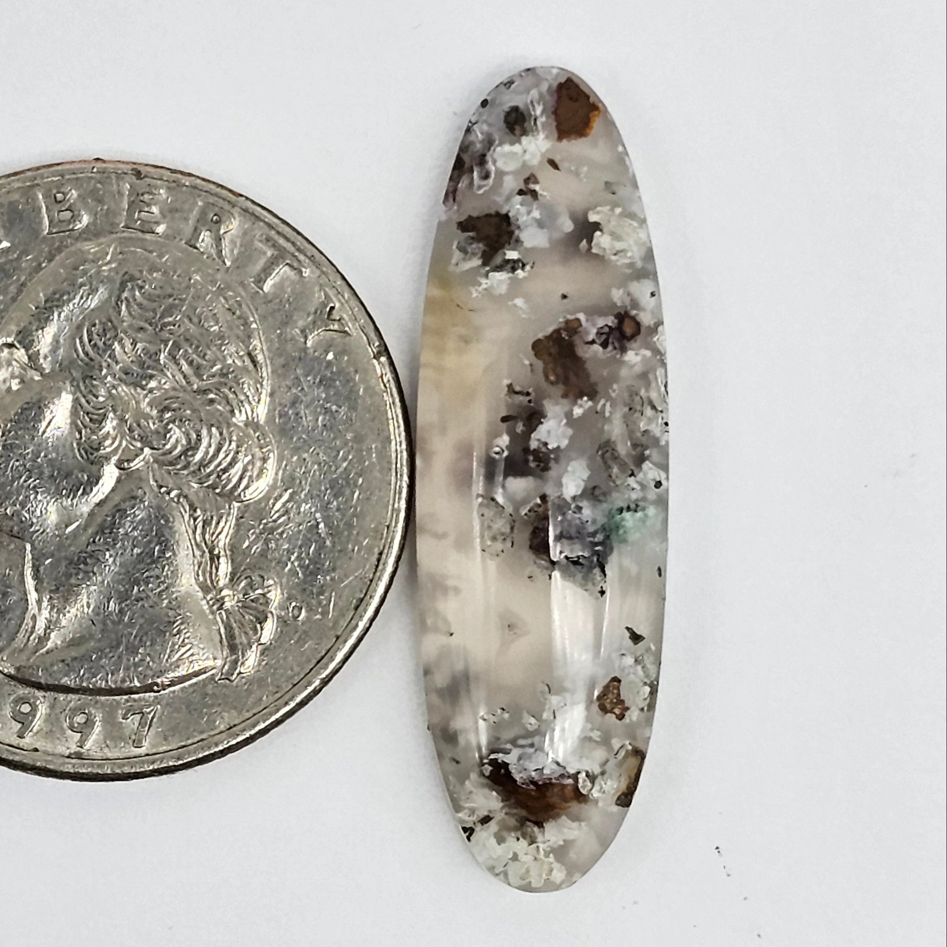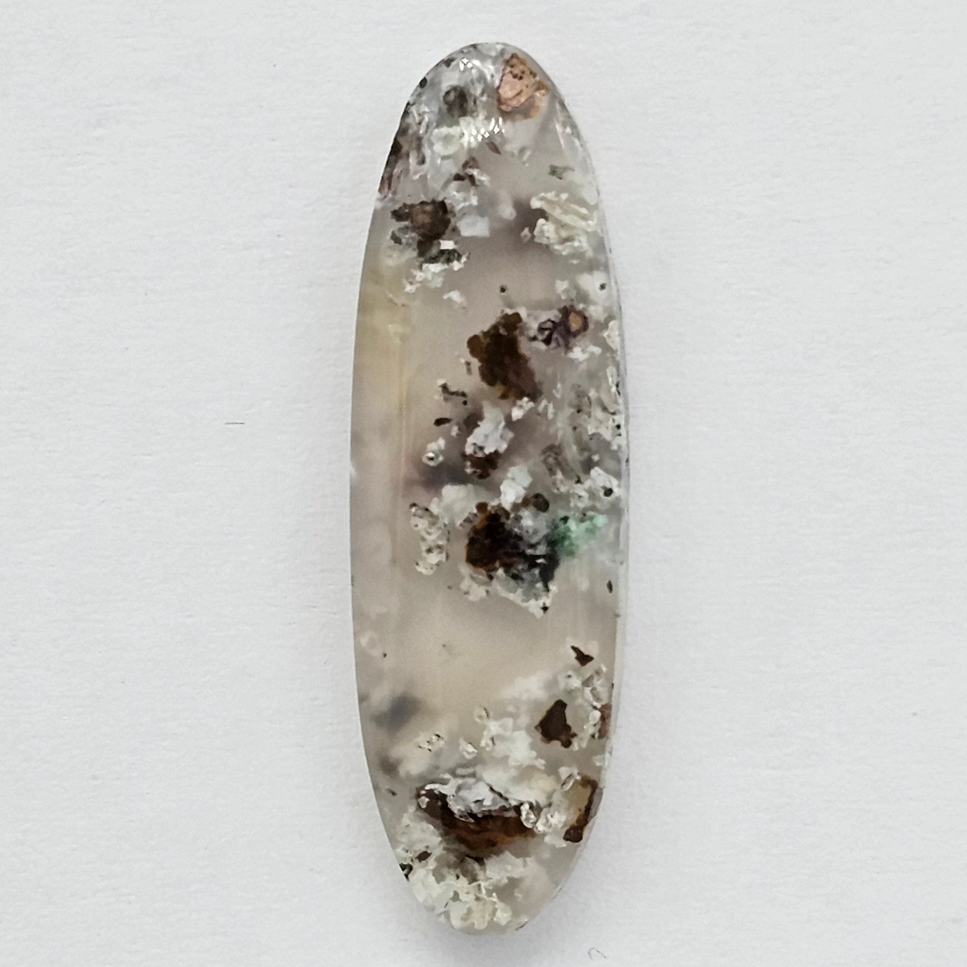 This stunning Chalcedony Agate Cabochon features a beautiful blend of soft hues with sparkling native copper inclusions. Its smooth, unique shape makes it ideal for creating unique jewelry pieces like earrings or pendants. Each cabochon showcases distinct patterns, adding charm and elegance to your collection. Enhance your designs with this captivating piece!