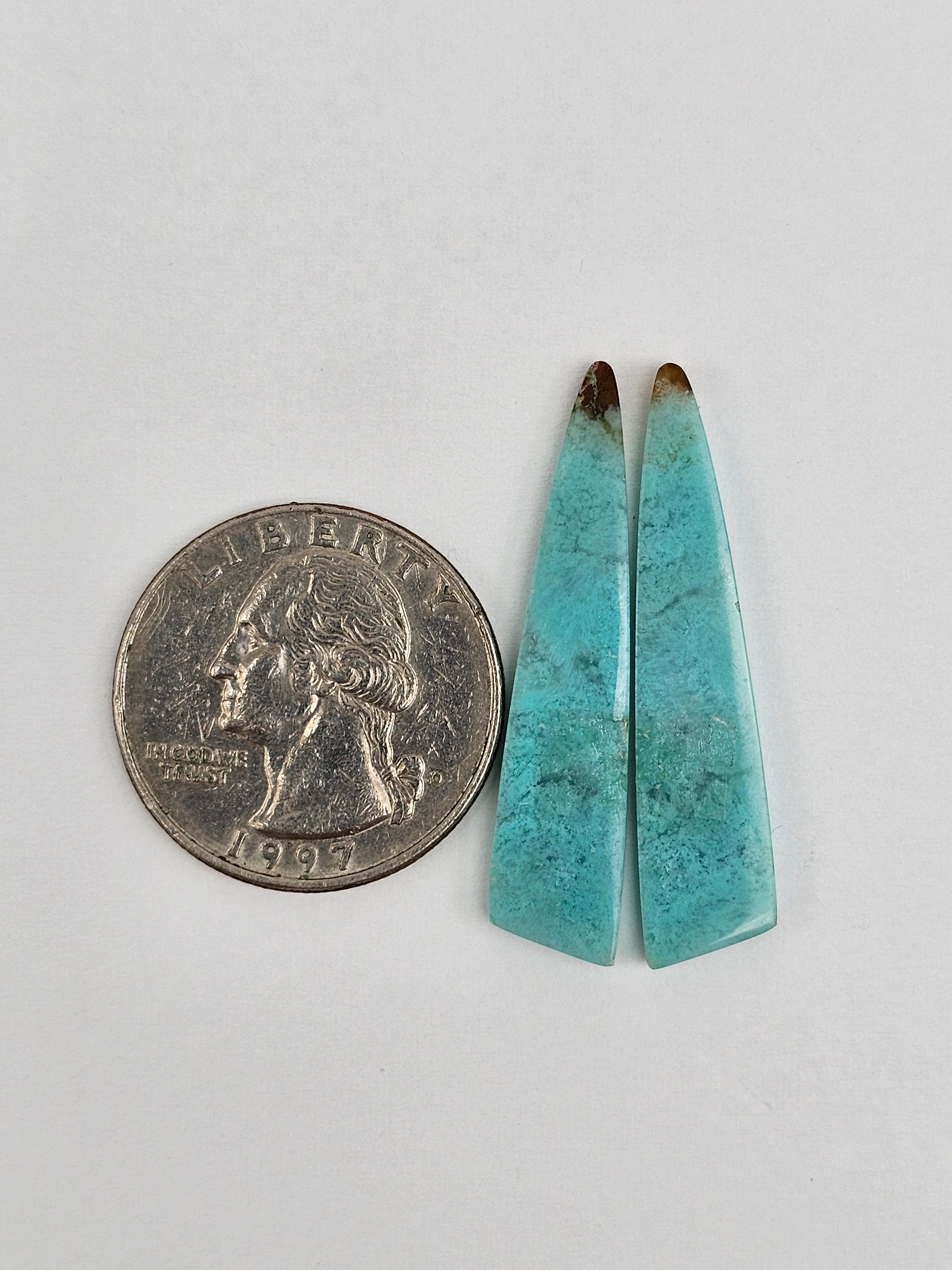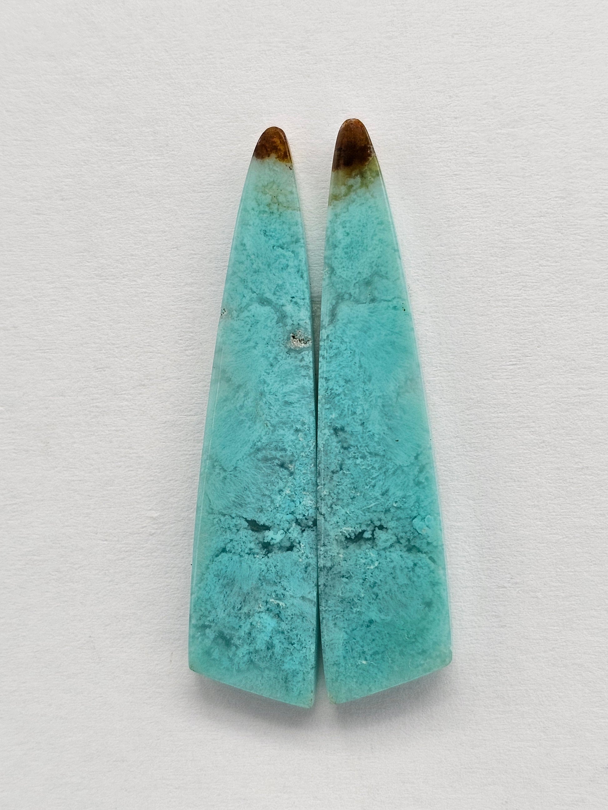 This exquisite cabochon pair showcases a refreshing blend of vibrant blue hues accented with earthy golden tones and intricate natural patterns. The elongated, tapered design makes this stones ideal for earrings, pendants, or other custom jewelry creations. Polished to highlight their unique character, these cabochons bring a touch of natural beauty and elegance to any design.
