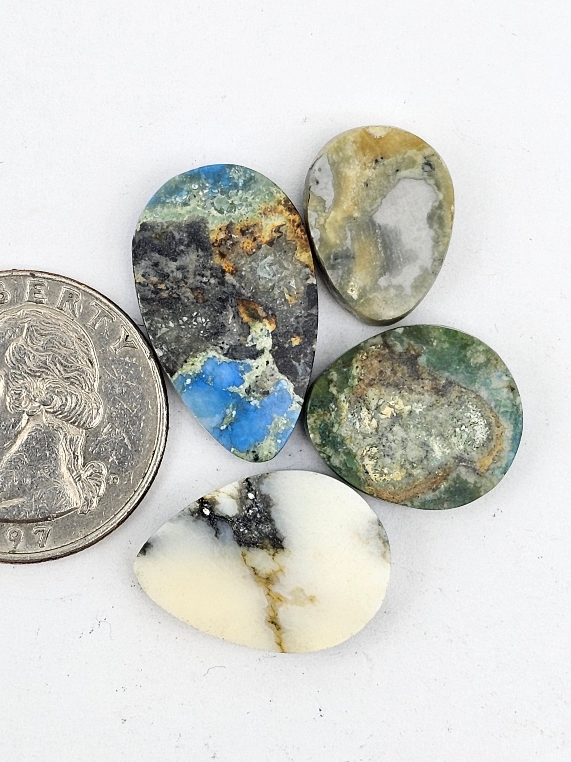 This set of rare Dark Moon Variscite cabochons features a beautiful mix of colores of blacks, whites and browns and greys, as well as lavender and even blue hues. Known for its unique matrix and rare colors, dark moon variscite adds a touch of natural beauty to any jewelry design. Perfect for creating one-of-a-kind statement pieces.