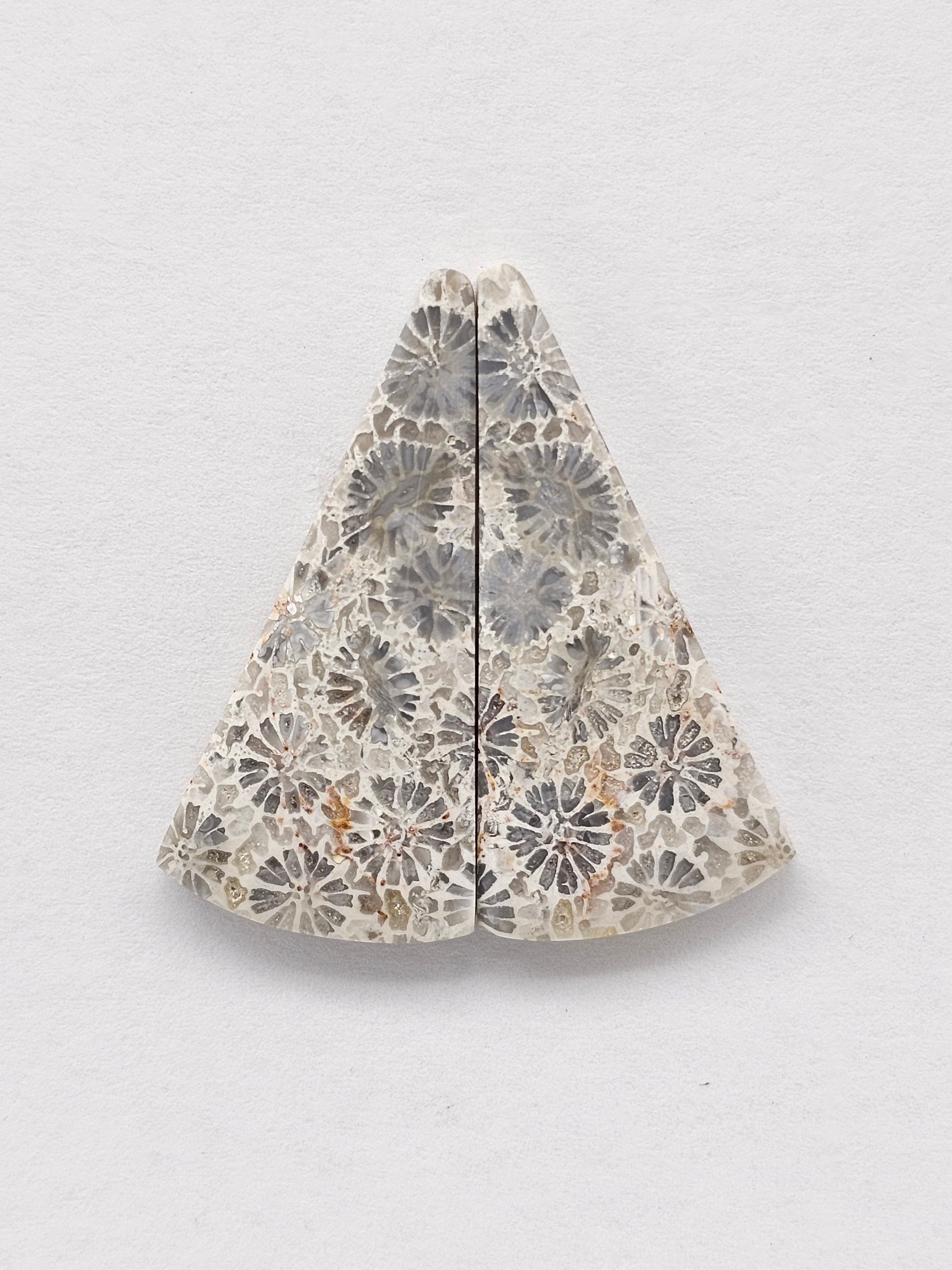 This fossilized coral pair showcases intricate natural flower-like patterns, formed over millions of years. Polished to a smooth finish, these matching cabochons are perfect for earrings or unique jewelry designs. A rare blend of history and beauty. Each piece is one of a kind, making it a special addition to any collection.