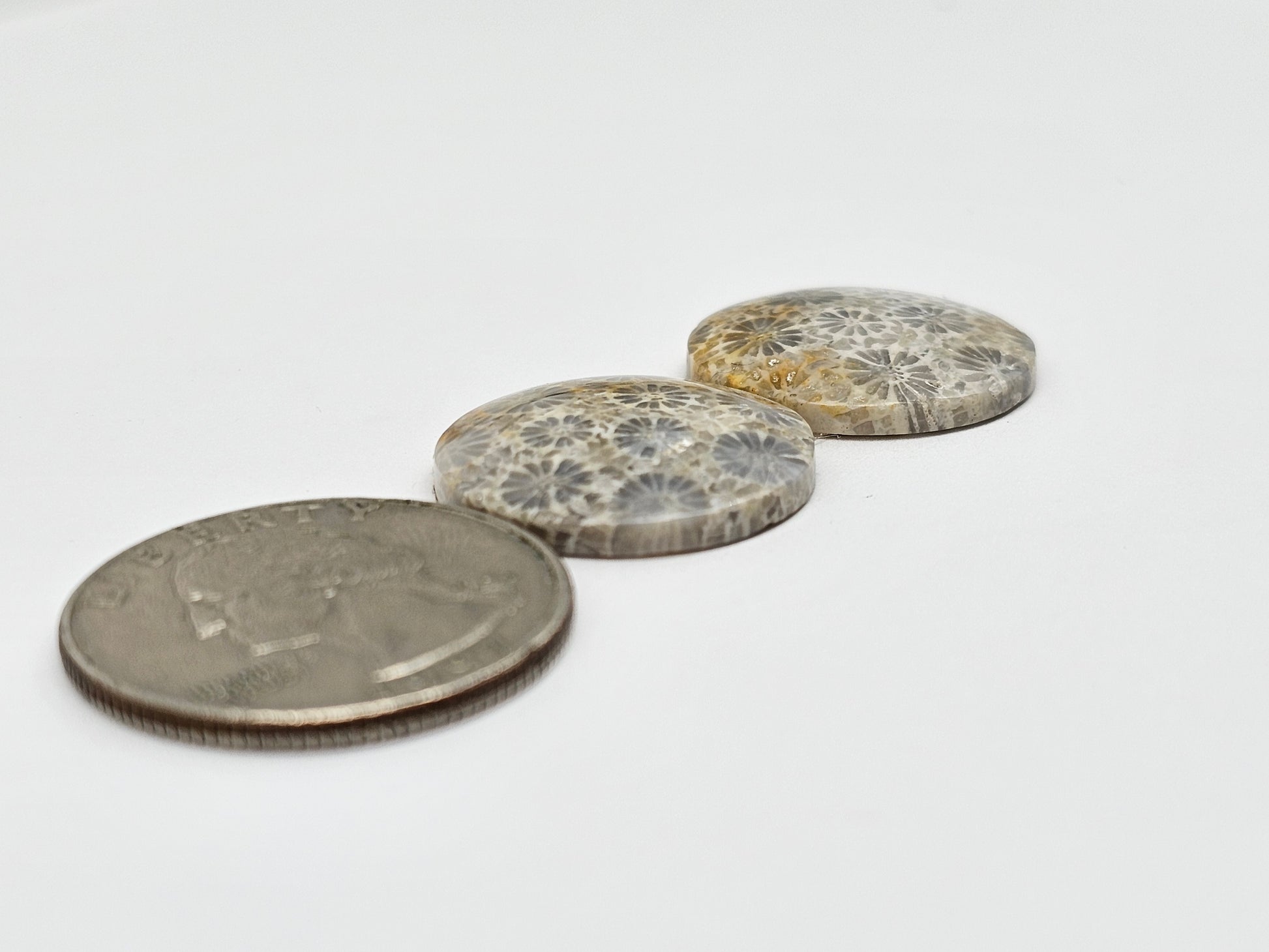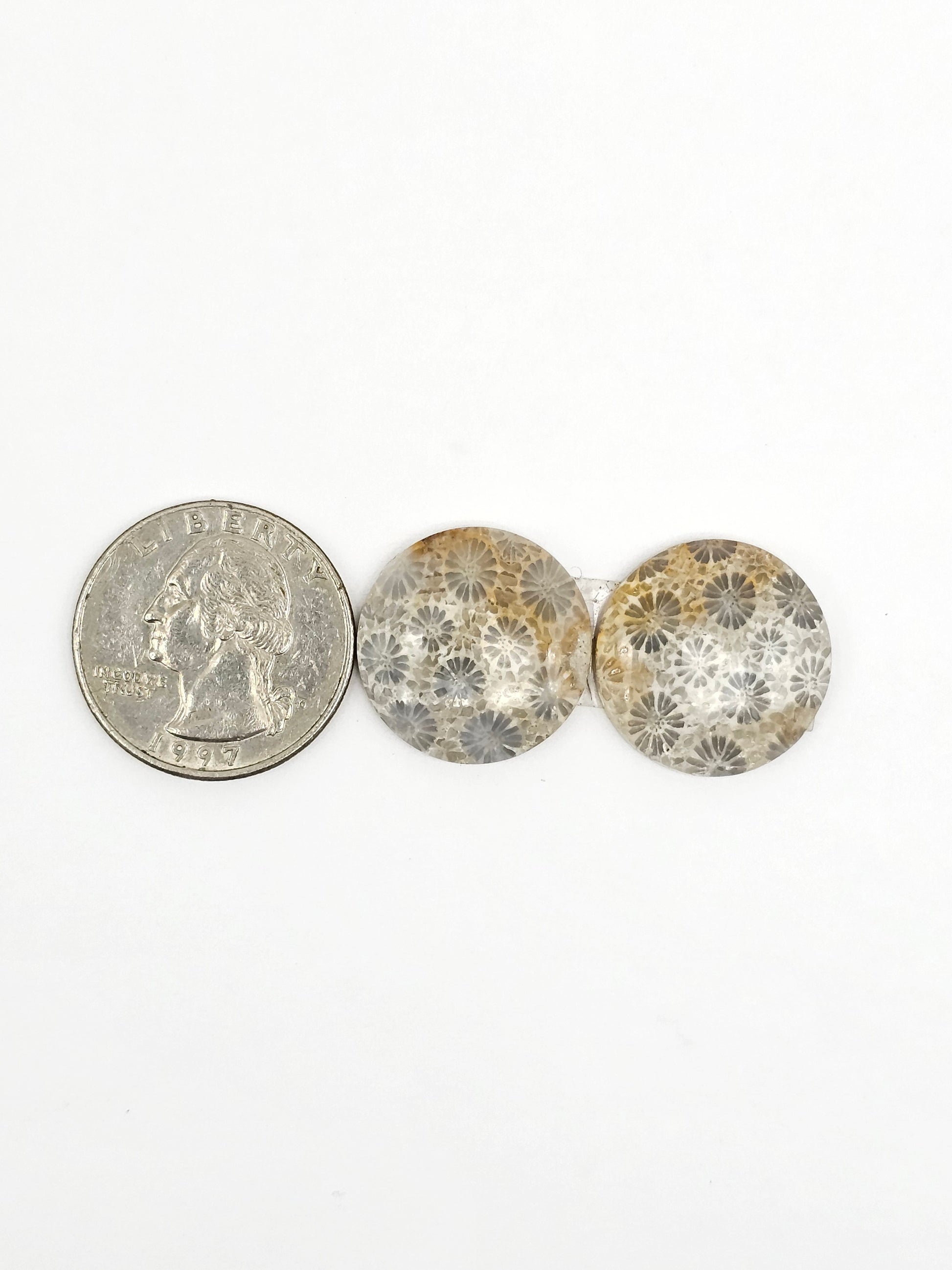 This fossilized coral pair showcases intricate natural flower-like patterns, formed over millions of years. Polished to a smooth finish, these matching cabochons are perfect for earrings or unique jewelry designs. A rare blend of history and beauty. Each piece is one of a kind, making it a special addition to any collection.