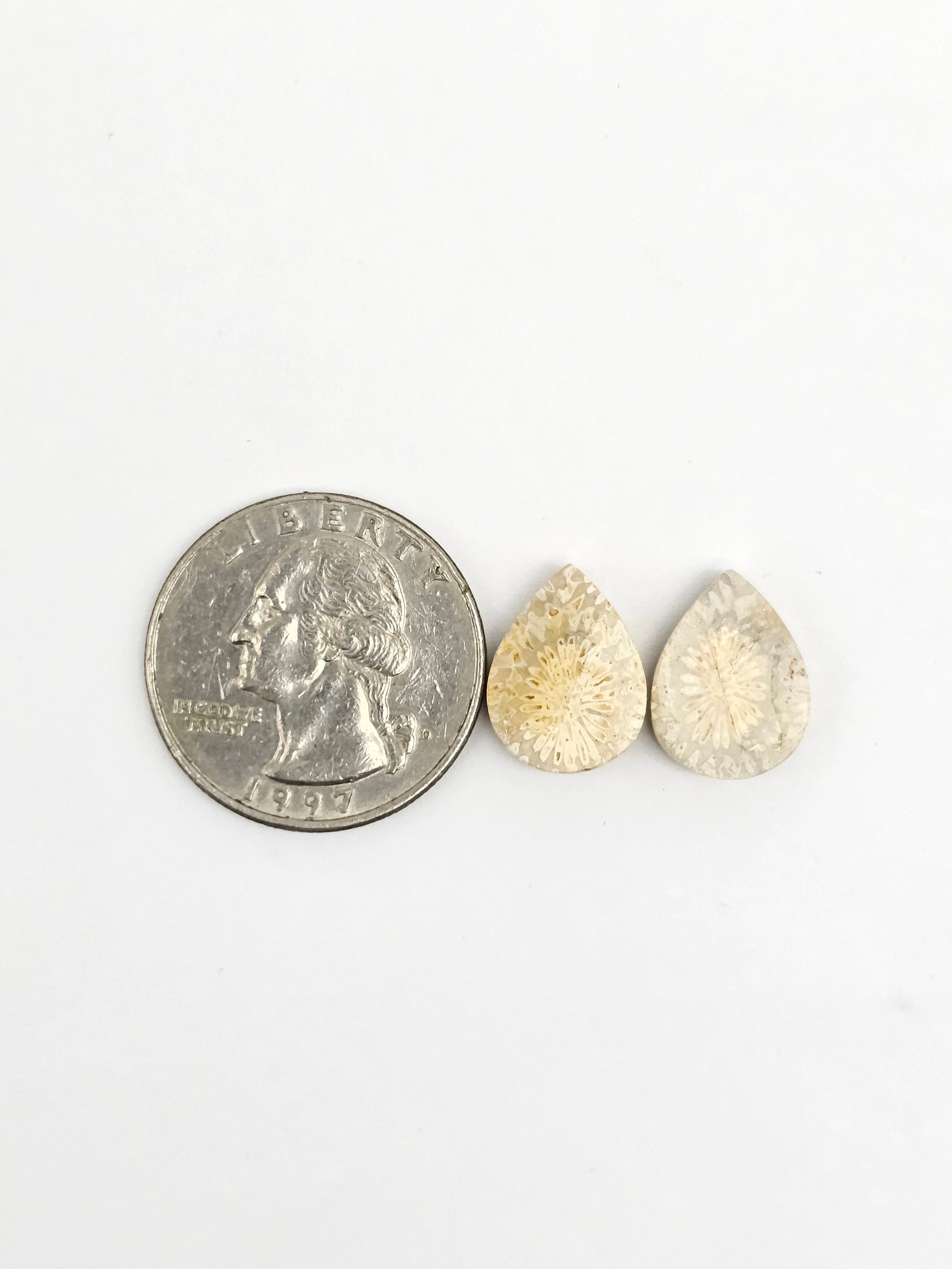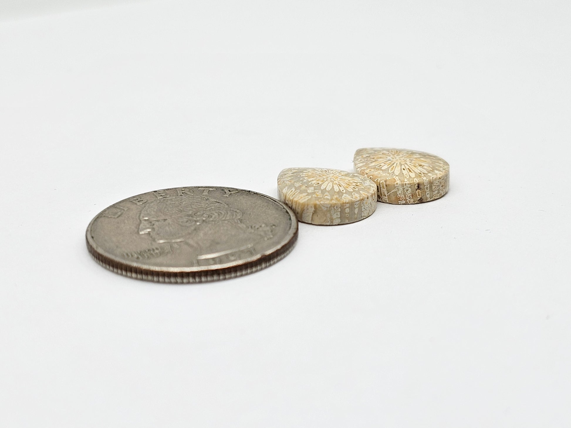This fossilized coral pair showcases intricate natural flower-like patterns, formed over millions of years. Polished to a smooth finish, these matching cabochons are perfect for earrings or unique jewelry designs. A rare blend of history and beauty. Each piece is one of a kind, making it a special addition to any collection.