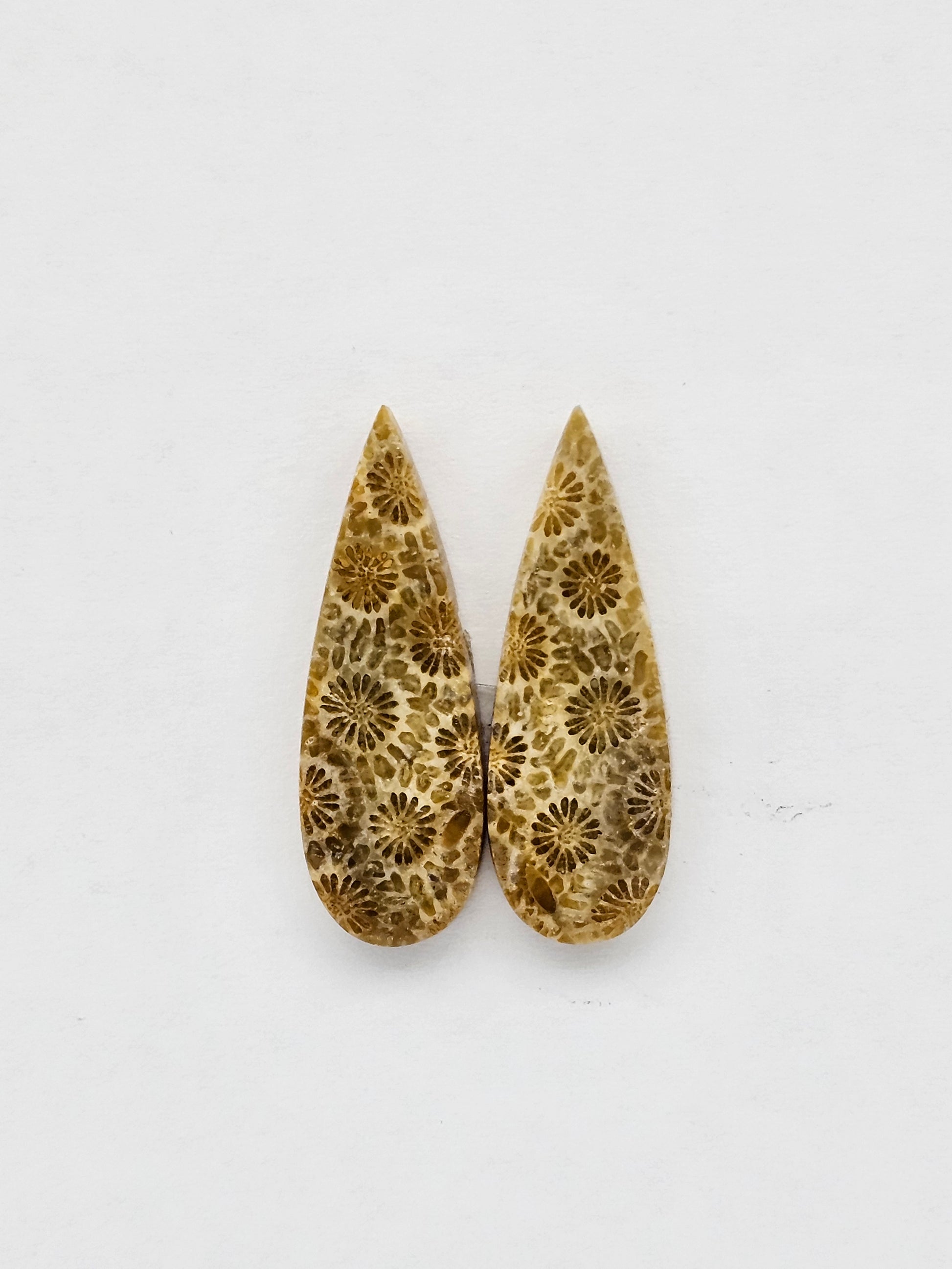 This fossilized coral pair showcases intricate natural flower-like patterns, formed over millions of years. Polished to a smooth finish, these matching cabochons are perfect for earrings or unique jewelry designs. A rare blend of history and beauty. Each piece is one of a kind, making it a special addition to any collection.