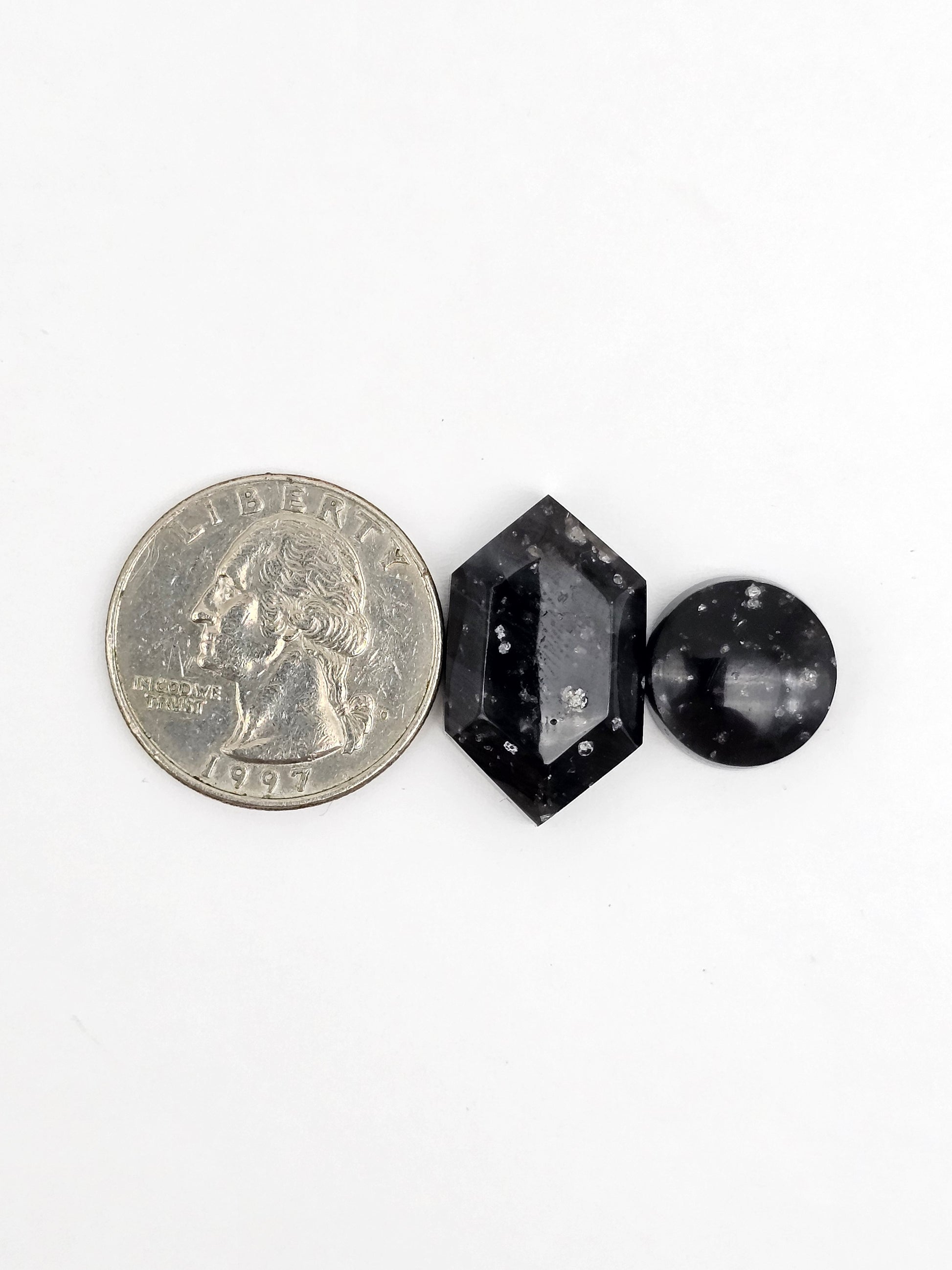 This galaxy obsidian cabochon set features two stunning pieces that capture the beauty of the universe. Each cabochon displays a rich black color with shimmering flecks resembling distant stars. Perfect for jewelry making or crafts, these pieces add a unique touch to any design. Their smooth finish enhances their natural elegance, making them a must-have for collectors and artisans alike. Elevate your creations with this charming set!