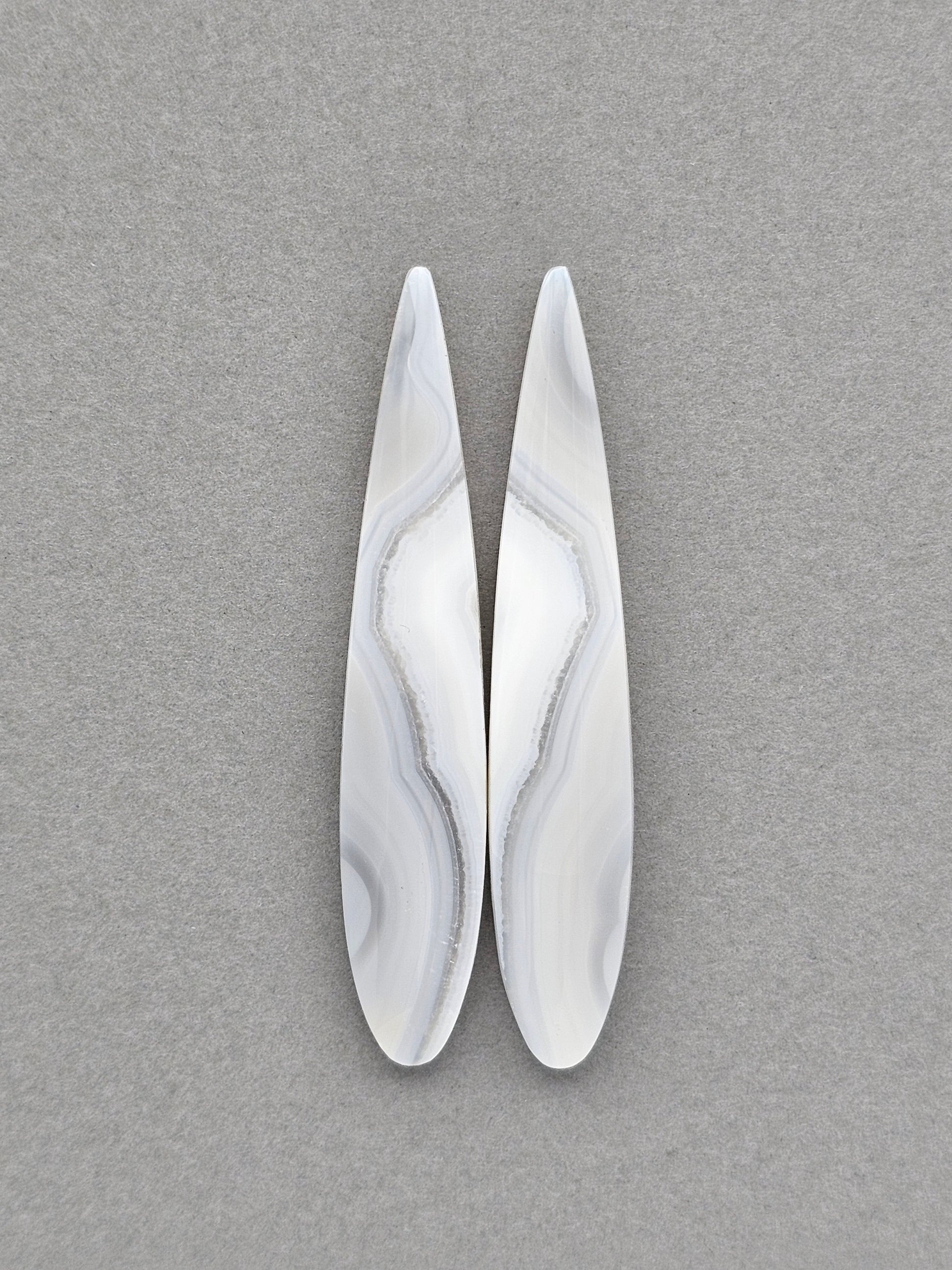This gray banded agate pair showcases elegant natural patterns with soft, flowing layers of white and gray. The stones are hand-cut into a sleek shape, perfect for earrings or unique jewelry designs. Agate is known for its calming energy and is a great choice for handmade designs.
