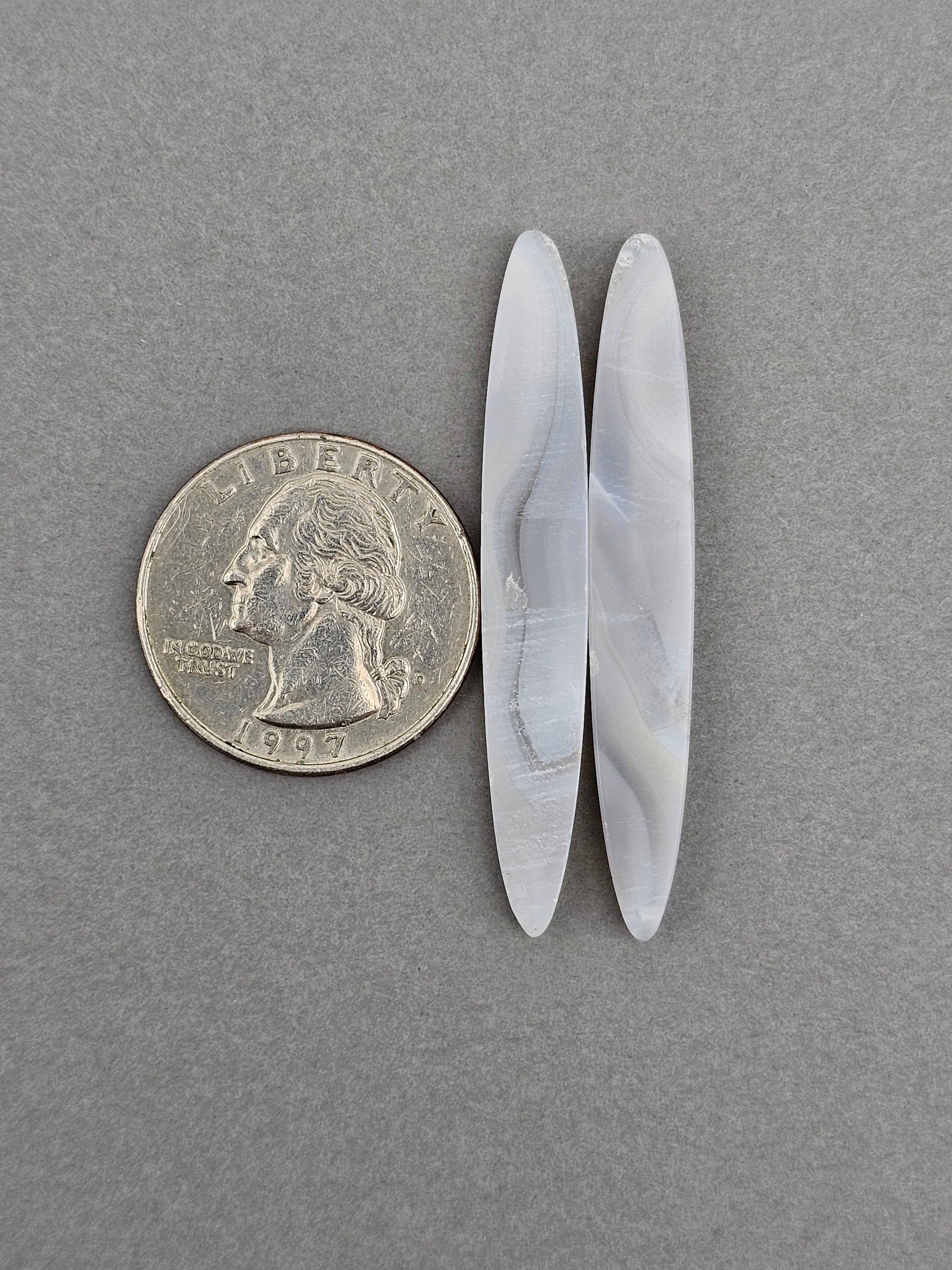 This gray banded agate pair showcases elegant natural patterns with soft, flowing layers of white and gray. The stones are hand-cut into a sleek shape, perfect for earrings or unique jewelry designs. Agate is known for its calming energy and is a great choice for handmade designs.