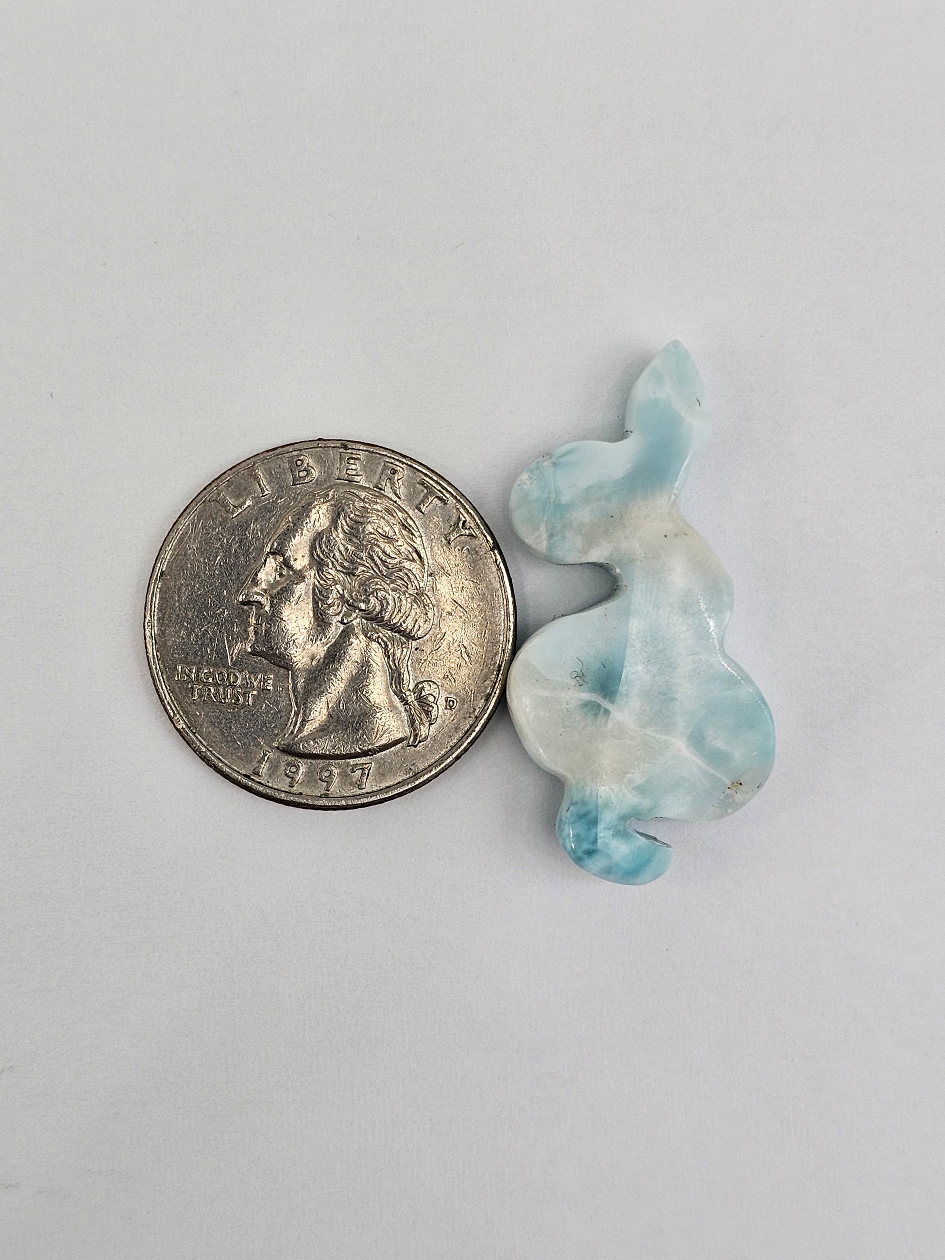 This beautiful Larimar Cabochon is shaped like a snake, bringing movement and life to the stone’s soft sky-blue and white patterns. The curves of the carving flow with the natural swirls of the Larimar, creating a piece that feels both dynamic and calming. A unique choice for a statement pendant or a one-of-a-kind addition to any collection.