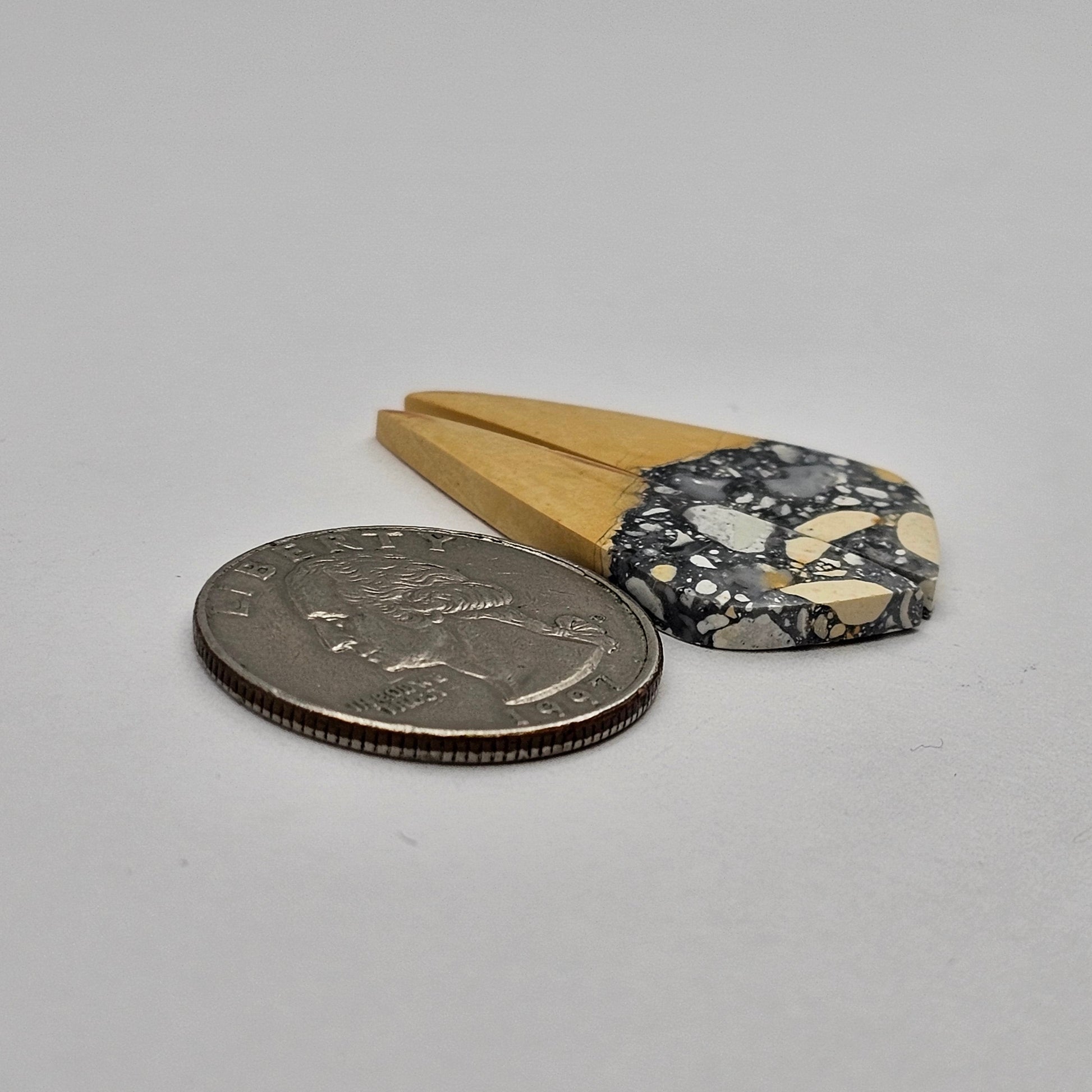 This matched pair of Maligano jasper cabochons showcases stunning natural patterns. Each piece features a mix of soft creams, bold blacks, and speckled grays. Perfect for jewelry making or collecting. These are ready to set and will add a one-of-a-kind touch to your creations.
