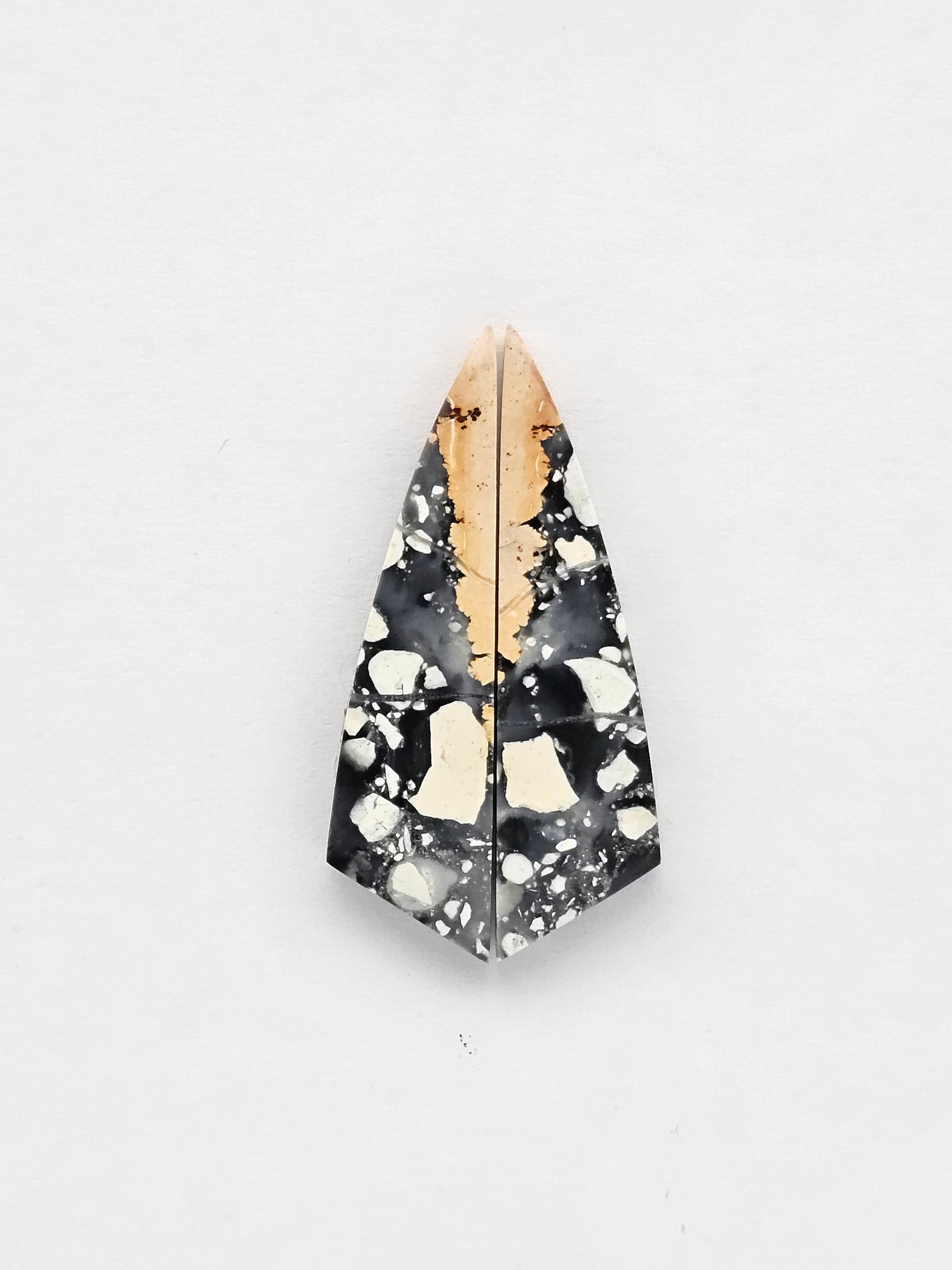 This matched pair of Maligano jasper cabochons showcases stunning natural patterns. Each teardrop features a mix of soft creams, bold blacks, and speckled grays. Perfect for jewelry making or collecting. These are ready to set and will add a one-of-a-kind touch to your creations.