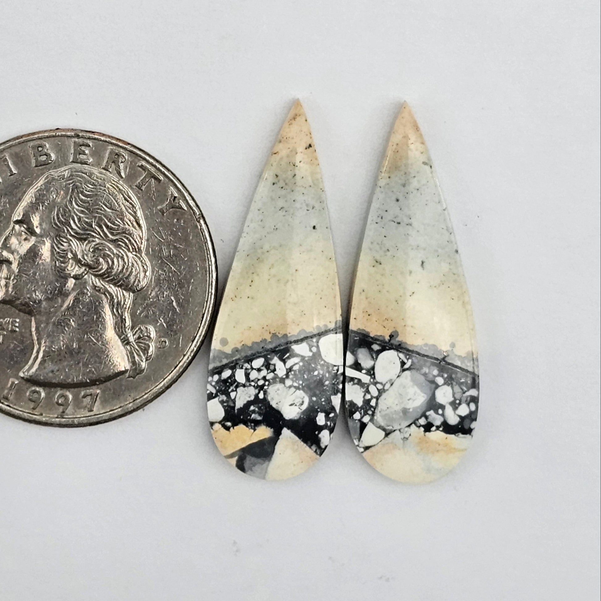 This matched pair of Maligano jasper cabochons showcases stunning natural patterns. Each piece features a mix of soft creams, bold blacks, and speckled grays. Perfect for jewelry making or collecting. These are ready to set and will add a one-of-a-kind touch to your creations.