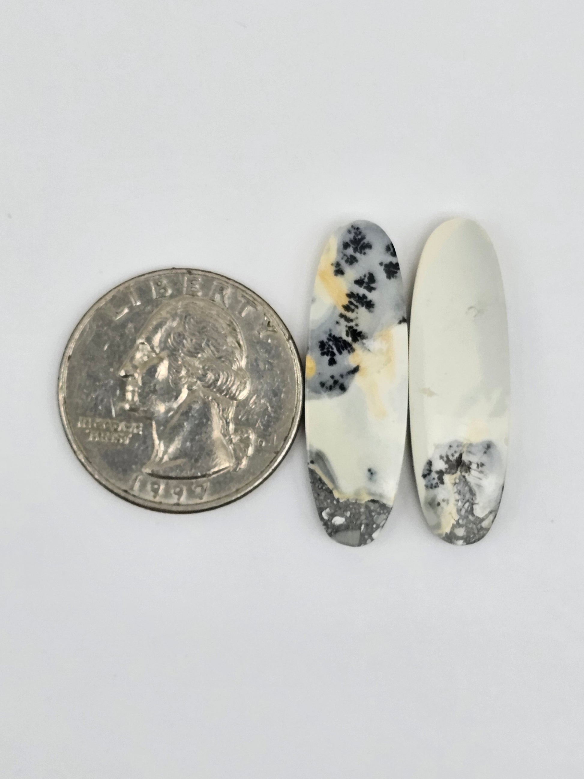 This matched pair of Maligano jasper cabochons showcases stunning natural patterns. Each piece features a mix of soft creams, bold blacks, and speckled grays. Perfect for jewelry making or collecting. These are ready to set and will add a one-of-a-kind touch to your creations.