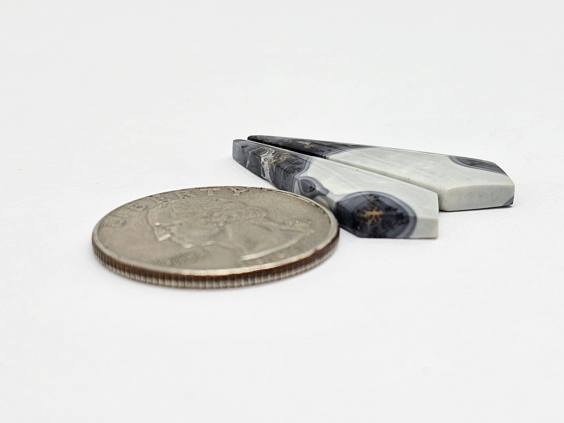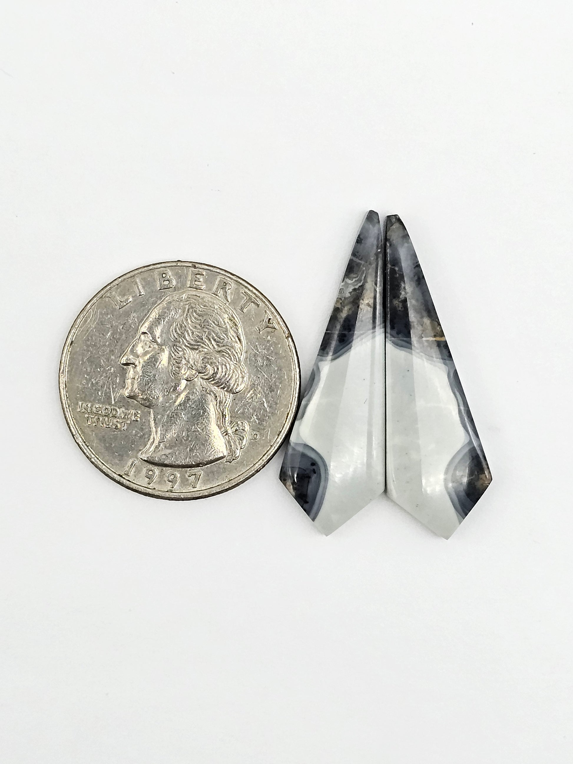 This matched pair of Maligano jasper cabochons showcases stunning natural patterns. Each piece features a mix of soft creams, bold blacks, and speckled grays. Perfect for jewelry making or collecting. These are ready to set and will add a one-of-a-kind touch to your creations.