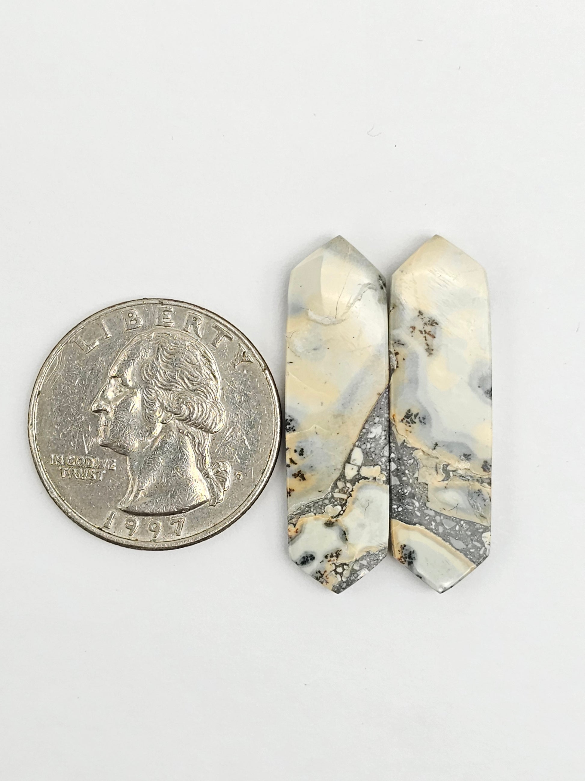 This matched pair of Maligano jasper cabochons showcases stunning natural patterns. Each piece features a mix of soft creams, bold blacks, and speckled grays. Perfect for jewelry making or collecting. These are ready to set and will add a one-of-a-kind touch to your creations.