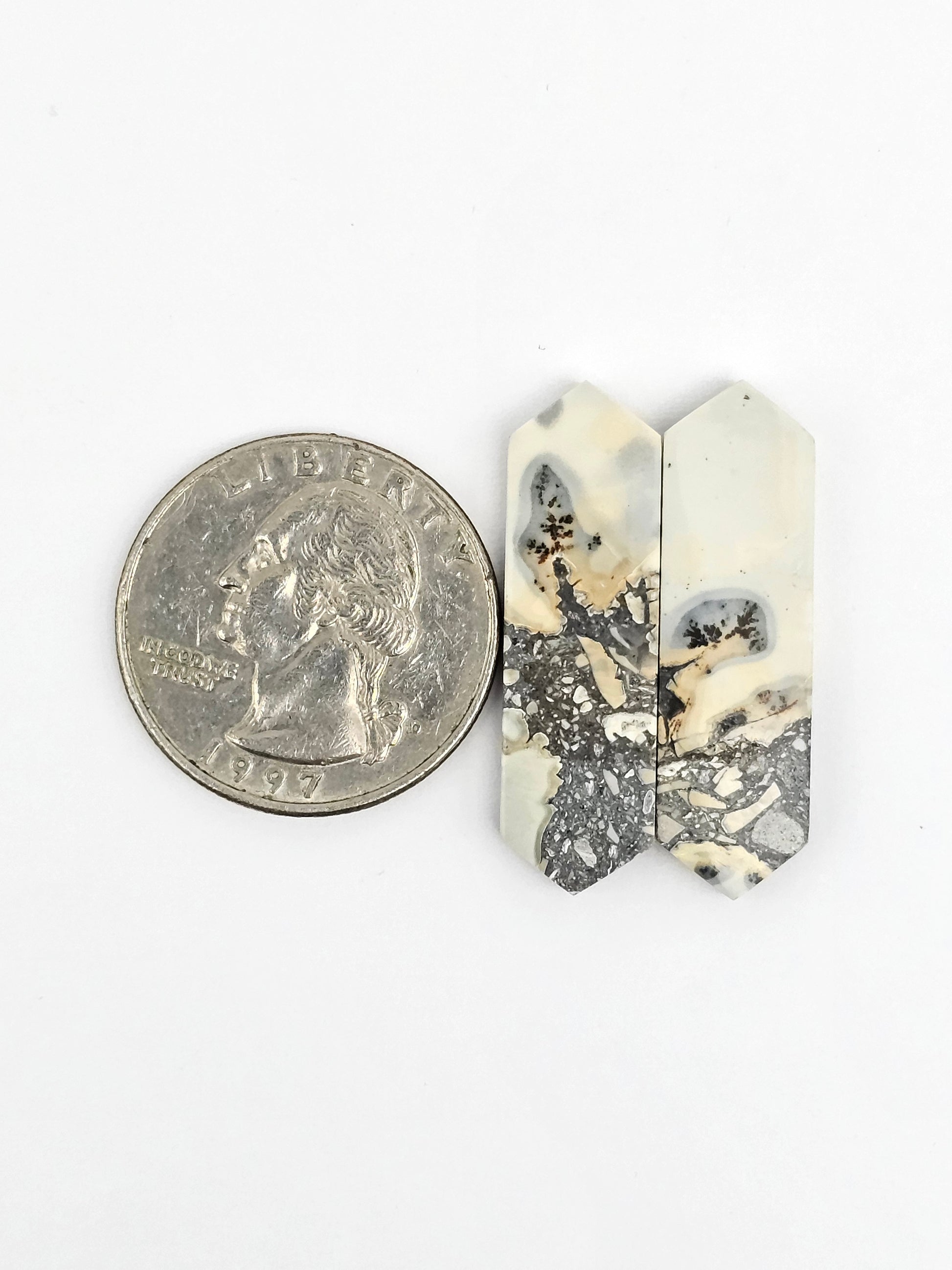 This matched pair of Maligano jasper cabochons showcases stunning natural patterns. Each piece features a mix of soft creams, bold blacks, and speckled grays. Perfect for jewelry making or collecting. These are ready to set and will add a one-of-a-kind touch to your creations.