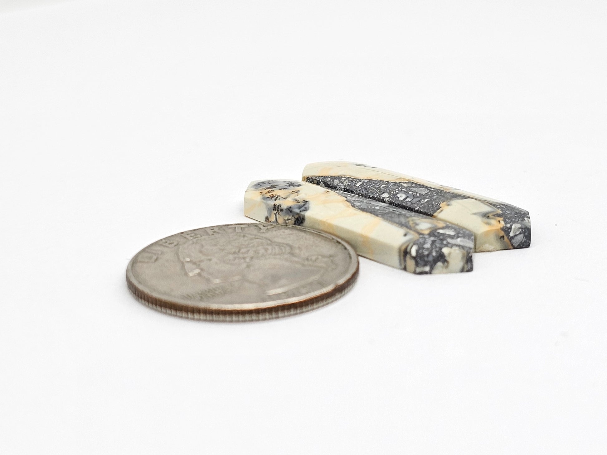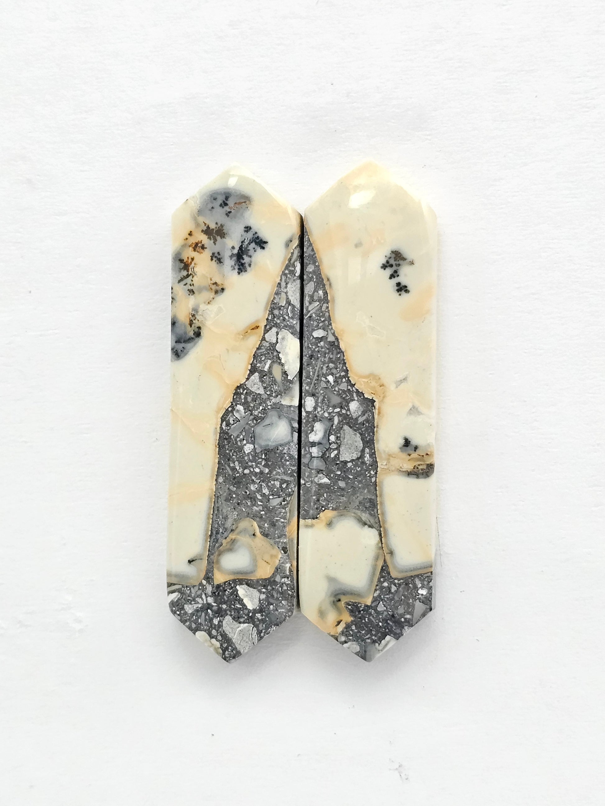 This matched pair of Maligano jasper cabochons showcases stunning natural patterns. Each piece features a mix of soft creams, bold blacks, and speckled grays. Perfect for jewelry making or collecting. These are ready to set and will add a one-of-a-kind touch to your creations.