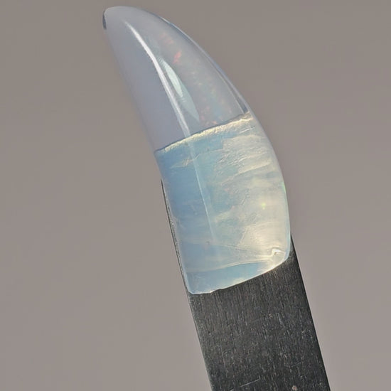 This natural Mexican Cantera opal claw or fang shaped cabochon showcases soft earthy tones, natural inclusions, and flashes created by ancient volcanic activity. Formed when silica-rich water settled into rhyolite, each stone is completely unique. Ethically sourced from lapidary families in Mexico and hand-cut to highlight its natural patterning, this cabochon is ideal for one-of-a-kind, intentional jewelry designs.