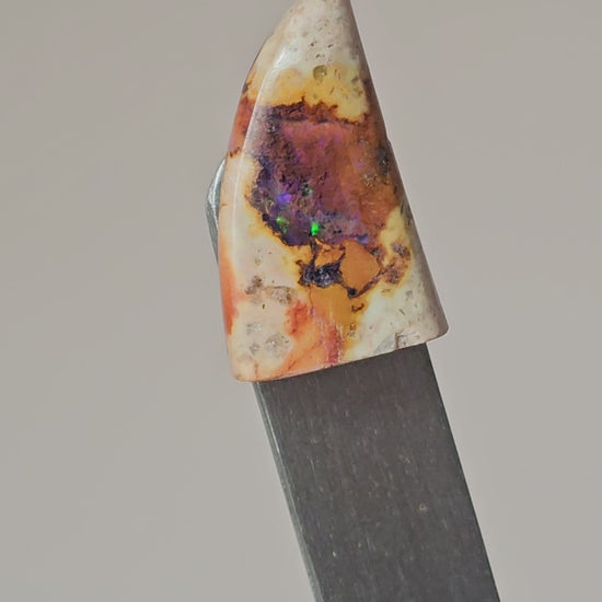 This natural Mexican Cantera opal claw or fang shaped cabochon showcases soft earthy tones, natural inclusions, and flashes created by ancient volcanic activity. Formed when silica-rich water settled into rhyolite, each stone is completely unique. Ethically sourced from lapidary families in Mexico and hand-cut to highlight its natural patterning, this cabochon is ideal for one-of-a-kind, intentional jewelry designs.