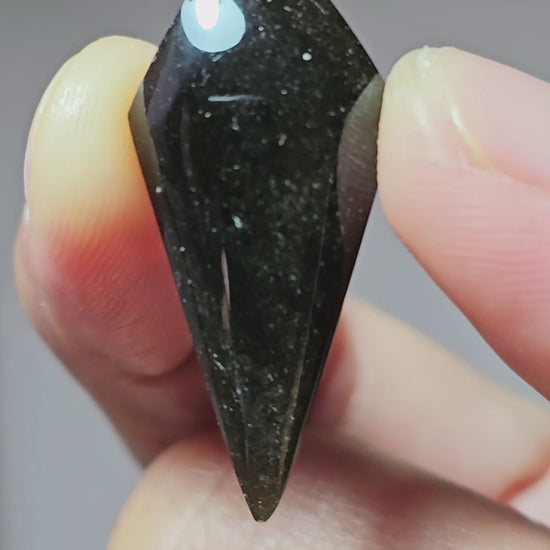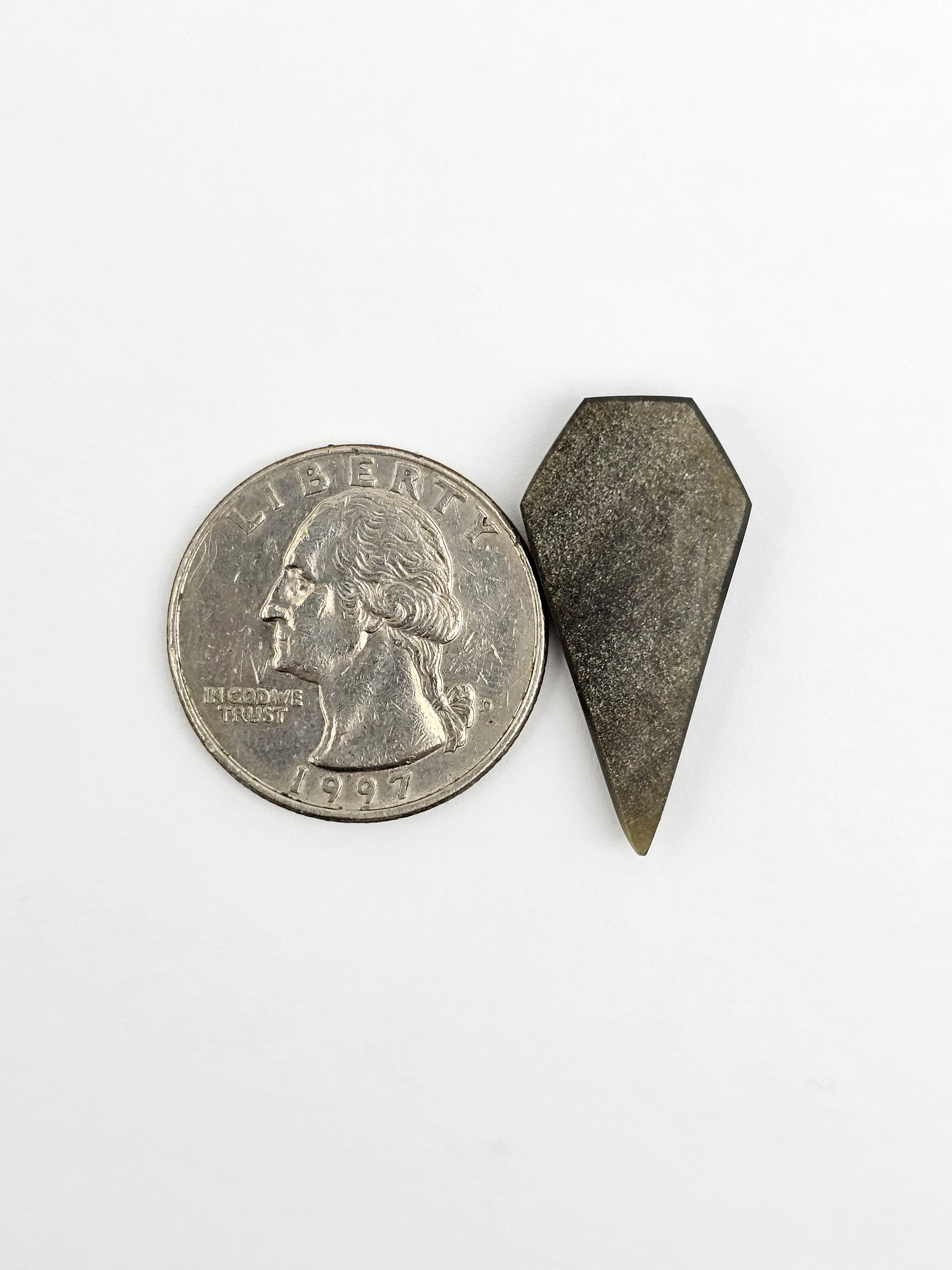 This obsidian cabochon is carved into a long shield shape, symbolizing protection and inner strength. Its dark surface holds a quiet sheen that reflects light with subtle depth, giving it a commanding yet elegant presence. Known for its grounding energy, obsidian makes this piece ideal for bold jewelry designs or as a meaningful addition to any crystal collection. Enhance your collection with this captivating piece!