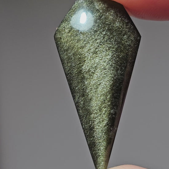 This obsidian cabochon is carved into a long shield shape, symbolizing protection and inner strength. Its dark surface holds a quiet sheen that reflects light with subtle depth, giving it a commanding yet elegant presence. Known for its grounding energy, obsidian makes this piece ideal for bold jewelry designs or as a meaningful addition to any crystal collection. Enhance your collection with this captivating piece!