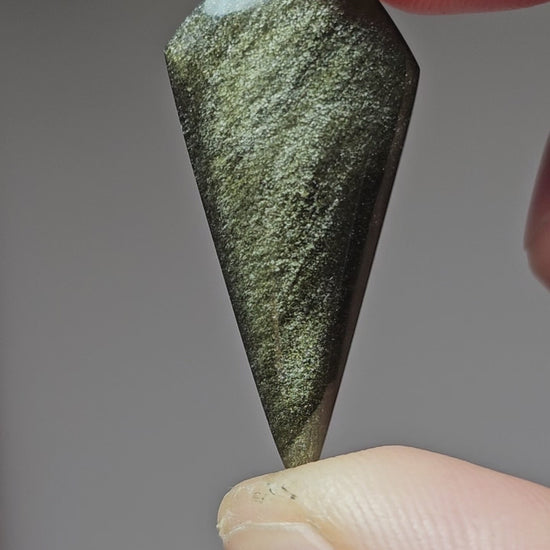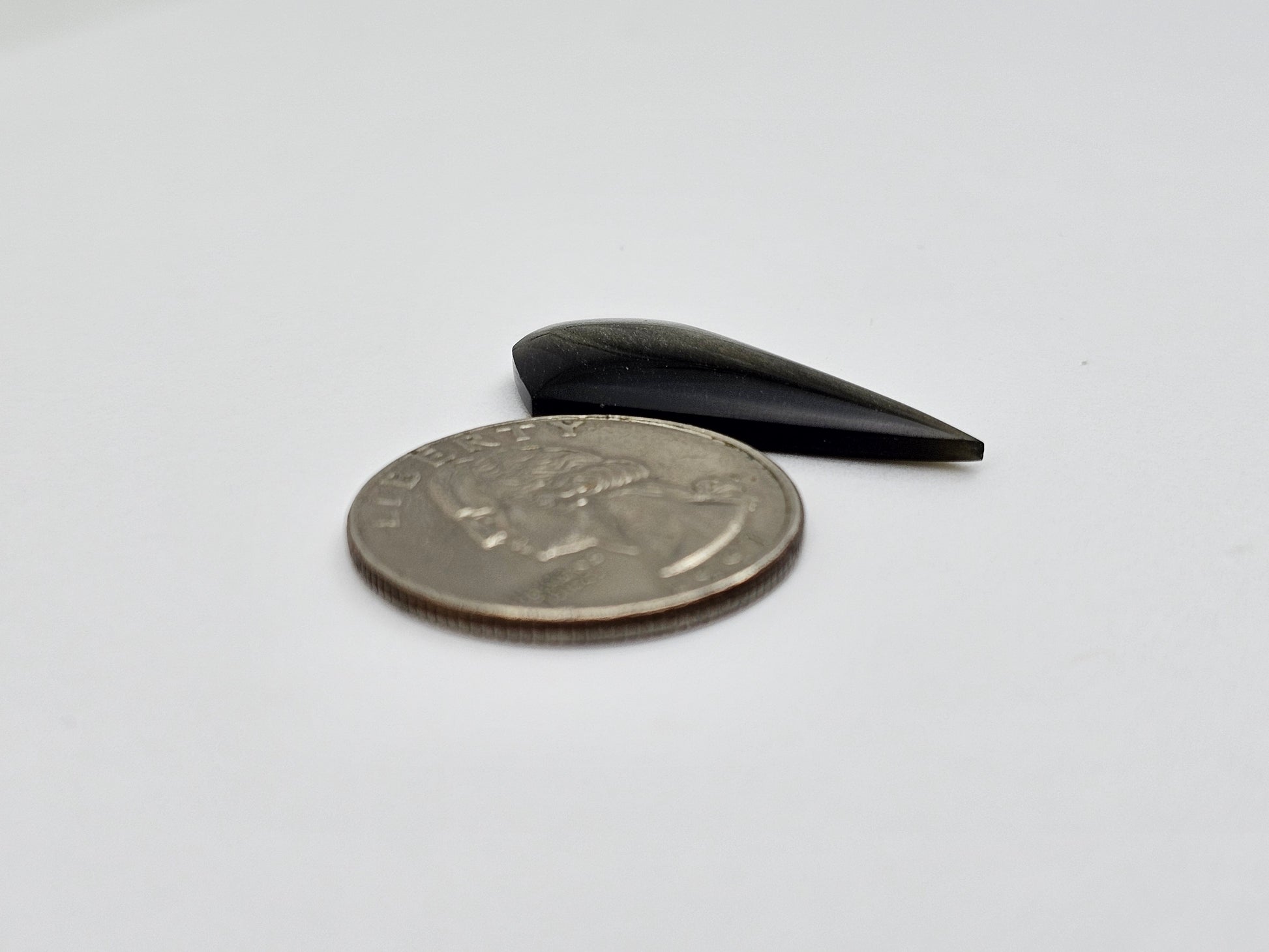 This obsidian cabochon is carved into a long shield shape, symbolizing protection and inner strength. Its dark surface holds a quiet sheen that reflects light with subtle depth, giving it a commanding yet elegant presence. Known for its grounding energy, obsidian makes this piece ideal for bold jewelry designs or as a meaningful addition to any crystal collection. Enhance your collection with this captivating piece!