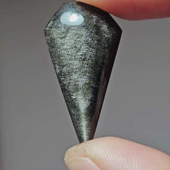 This obsidian cabochon is carved into a long shield shape, symbolizing protection and inner strength. Its dark surface holds a quiet sheen that reflects light with subtle depth, giving it a commanding yet elegant presence. Known for its grounding energy, obsidian makes this piece ideal for bold jewelry designs or as a meaningful addition to any crystal collection. Enhance your collection with this captivating piece!
