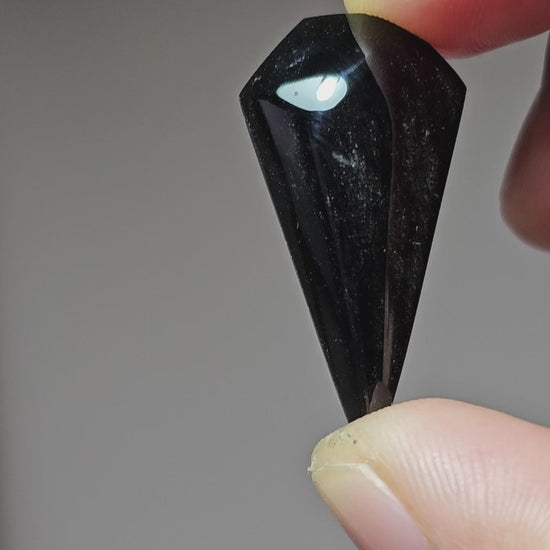 This obsidian cabochon is carved into a long shield shape, symbolizing protection and inner strength. Its dark surface holds a quiet sheen that reflects light with subtle depth, giving it a commanding yet elegant presence. Known for its grounding energy, obsidian makes this piece ideal for bold jewelry designs or as a meaningful addition to any crystal collection. Enhance your collection with this captivating piece!