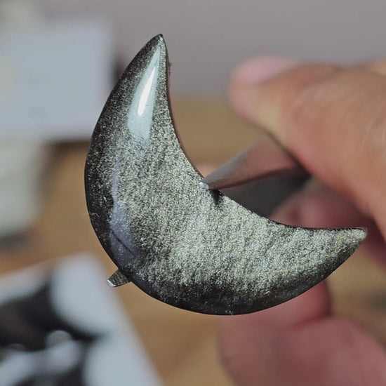 This Gold sheen obsidian cabochon is carved into a crescent moon, displaying a dark body with shimmering silver flashes under the light. The sleek polish enhances its reflective glow, giving the piece a mystical and elegant presence. A striking choice for celestial-inspired jewelry or as a unique collector’s piece. Enhance your collection with this captivating piece!