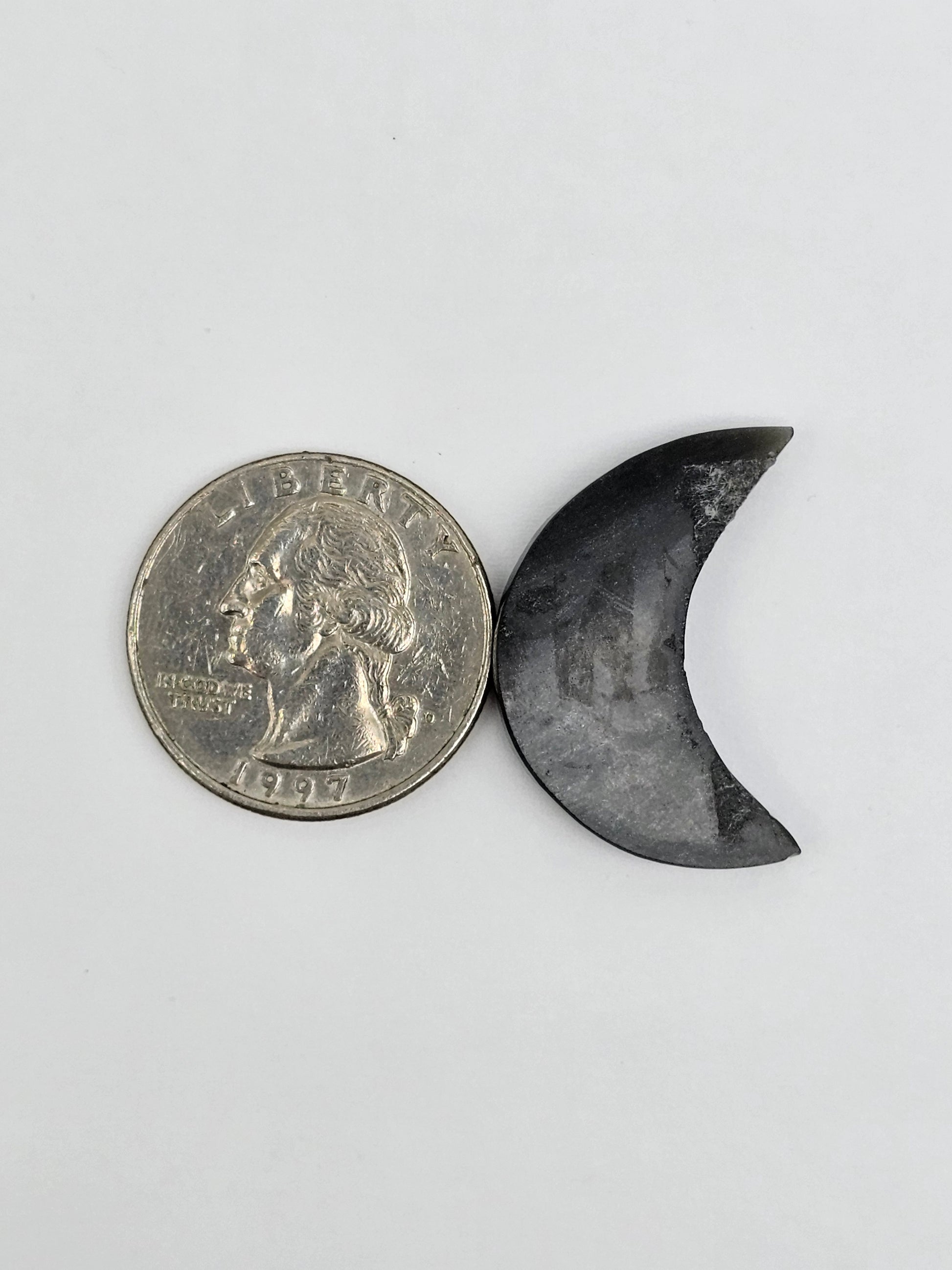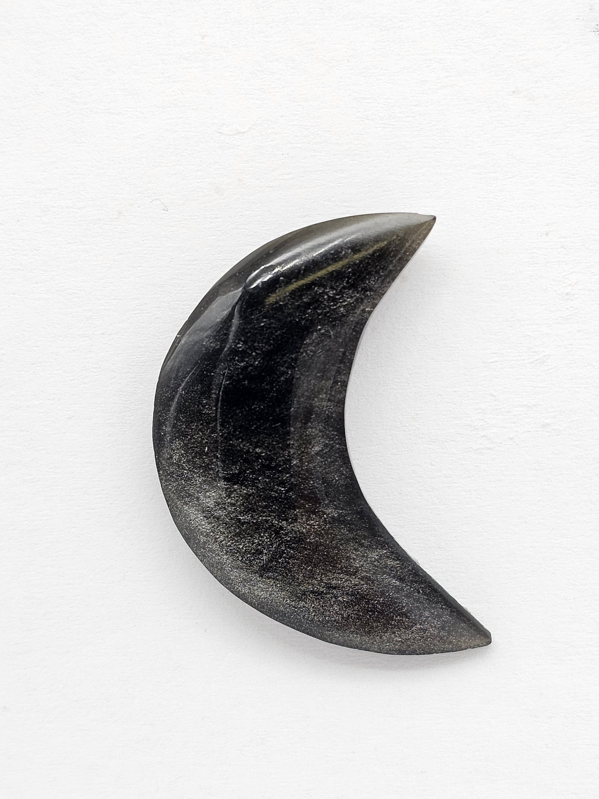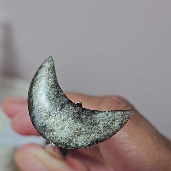 This gold sheen obsidian cabochon is carved into a crescent moon, displaying a dark body with shimmering silver flashes under the light. The sleek polish enhances its reflective glow, giving the piece a mystical and elegant presence. A striking choice for celestial-inspired jewelry or as a unique collector’s piece. Enhance your collection with this captivating piece!
