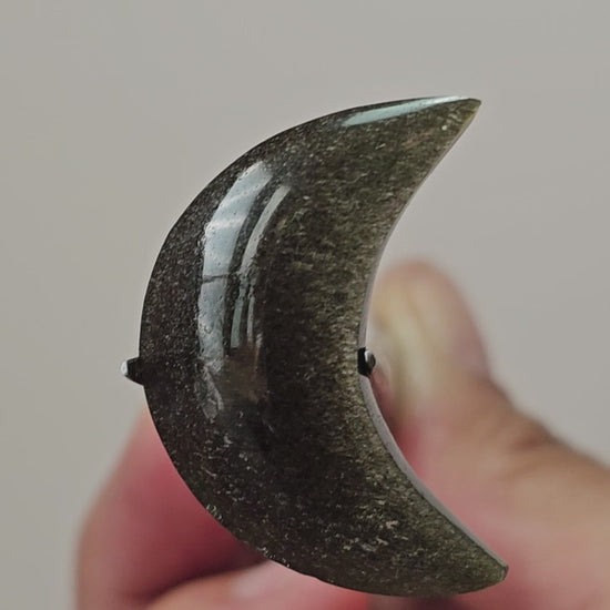 This golden obsidian cabochon is carved into a crescent moon, displaying a dark body with shimmering gold flashes under the light. The sleek polish enhances its reflective glow, giving the piece a mystical and elegant presence. A striking choice for celestial-inspired jewelry or as a unique collector’s piece. Enhance your collection with this captivating piece!