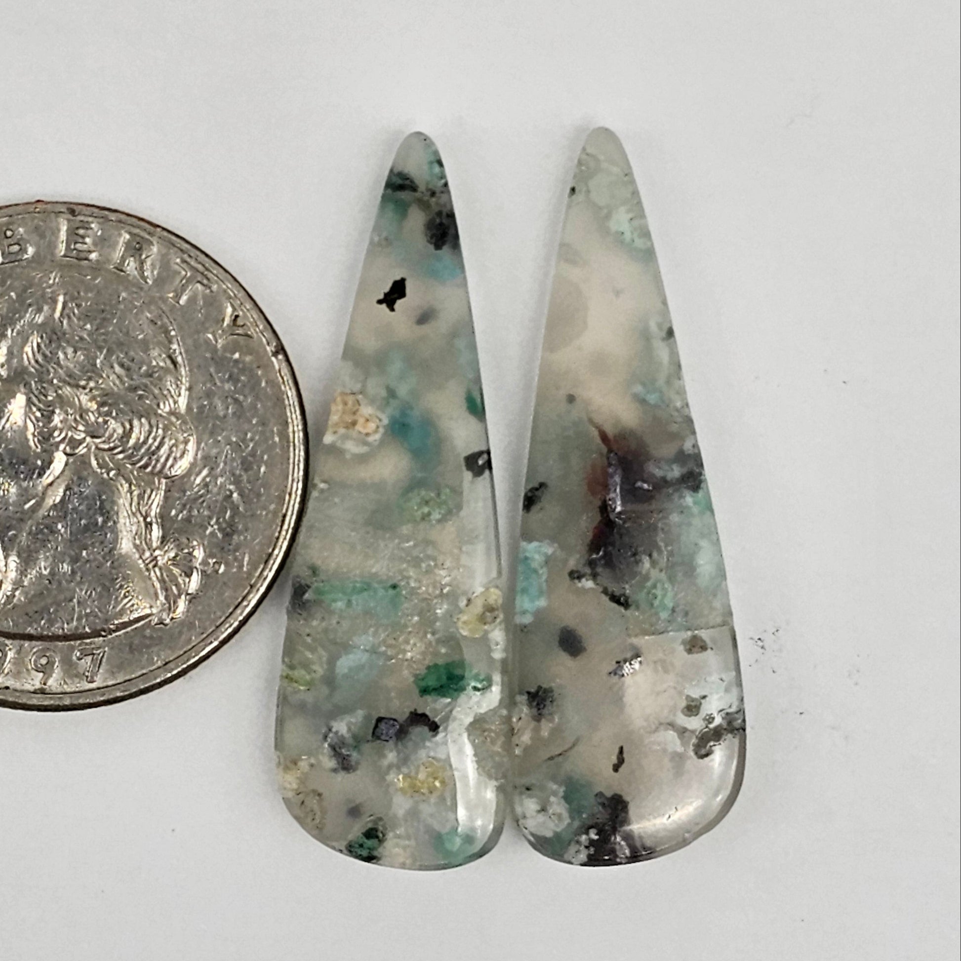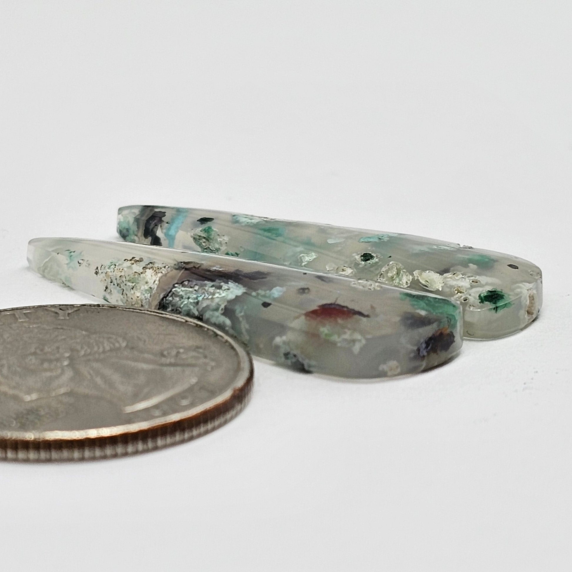 This stunning pair of Sugar Water Flower Agate Cabochons features beautiful patterns with vibrant greens and hints of copper. Their smooth, elongated shape is perfect for creating unique jewelry pieces like earrings or pendants. Each cabochon showcases intricate details, adding a touch of nature-inspired beauty to your designs. Elevate your collection with this eye-catching pair!