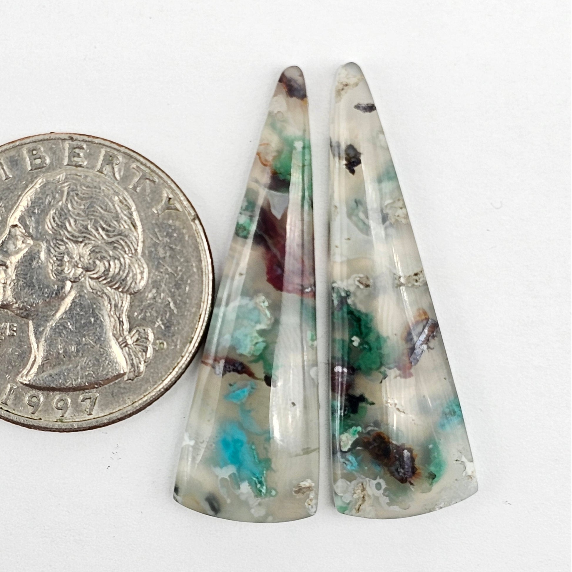 This stunning pair of Sugar Water Flower Agate Cabochons features beautiful patterns with vibrant greens and hints of copper. Their smooth, elongated shape is perfect for creating unique jewelry pieces like earrings or pendants. Each cabochon showcases intricate details, adding a touch of nature-inspired beauty to your designs. Elevate your collection with this eye-catching pair!