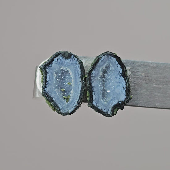 Natural mini Tabasco geode cabochon pair featuring sparkling druzy centers and earthy matrix formed through volcanic activity. Hand cut and selected in Mexico for jewelry making, each matching pair is one of a kind. Ideal for silversmiths and earring makers creating studs, dangles, or statement earrings with natural texture and contrast.