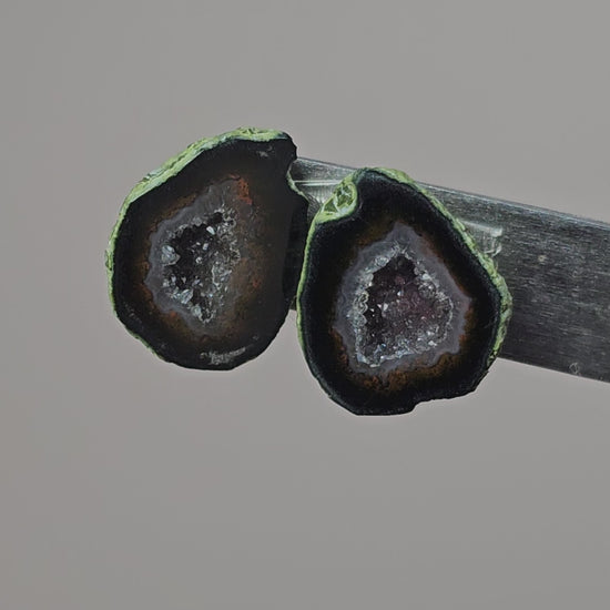 Natural mini Tabasco geode cabochon pair featuring sparkling druzy centers and earthy matrix formed through volcanic activity. Hand cut and selected in Mexico for jewelry making, each matching pair is one of a kind. Ideal for silversmiths and earring makers creating studs, dangles, or statement earrings with natural texture and contrast.