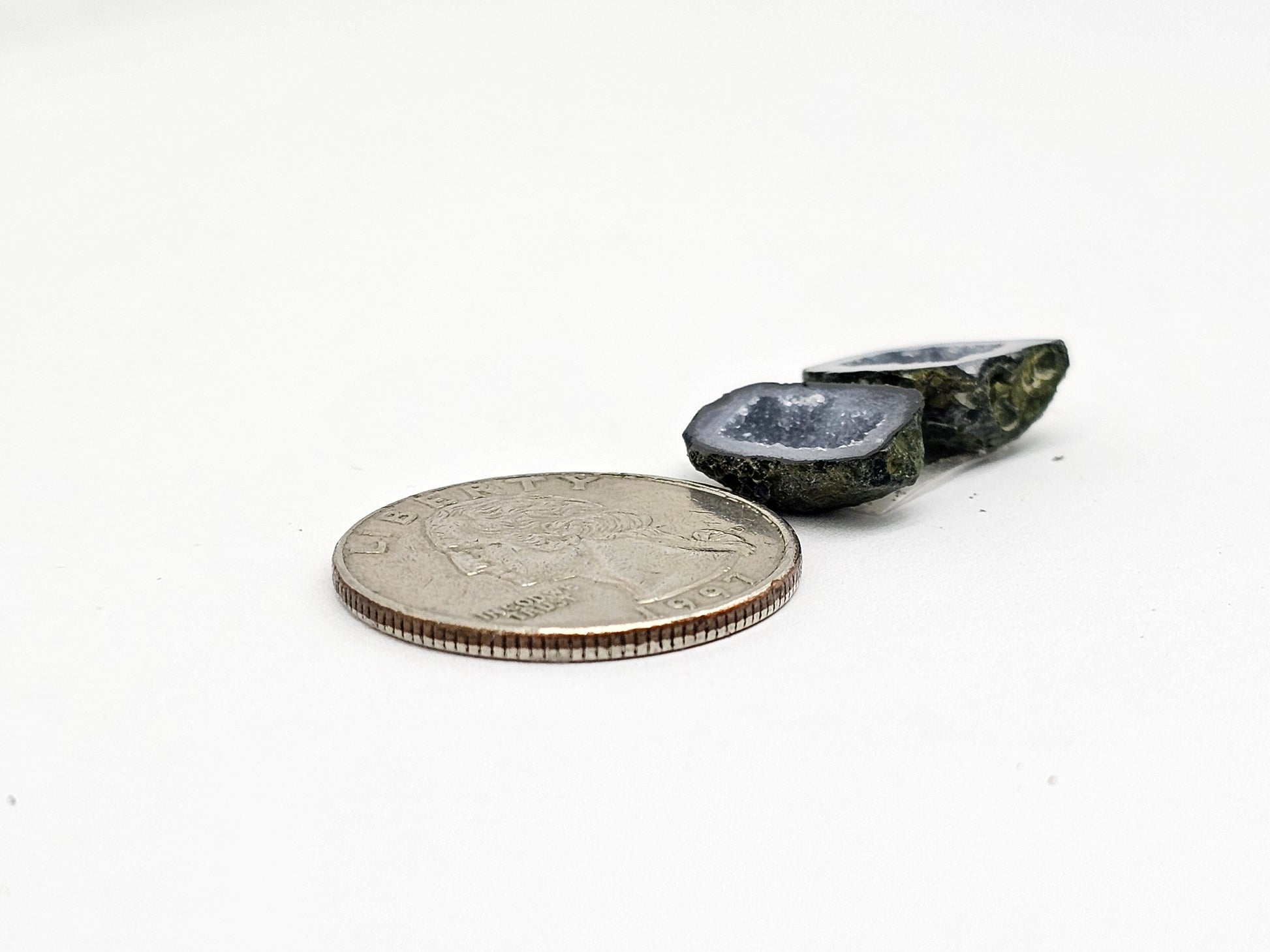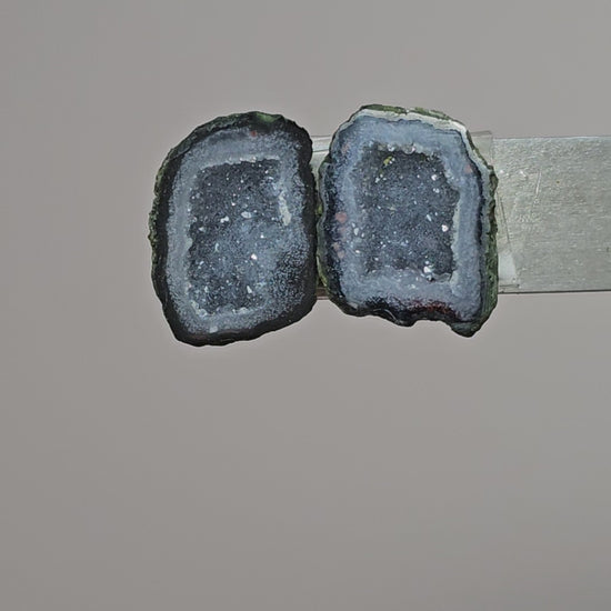 Natural mini Tabasco geode cabochon pair featuring sparkling druzy centers and earthy matrix formed through volcanic activity. Hand cut and selected in Mexico for jewelry making, each matching pair is one of a kind. Ideal for silversmiths and earring makers creating studs, dangles, or statement earrings with natural texture and contrast.